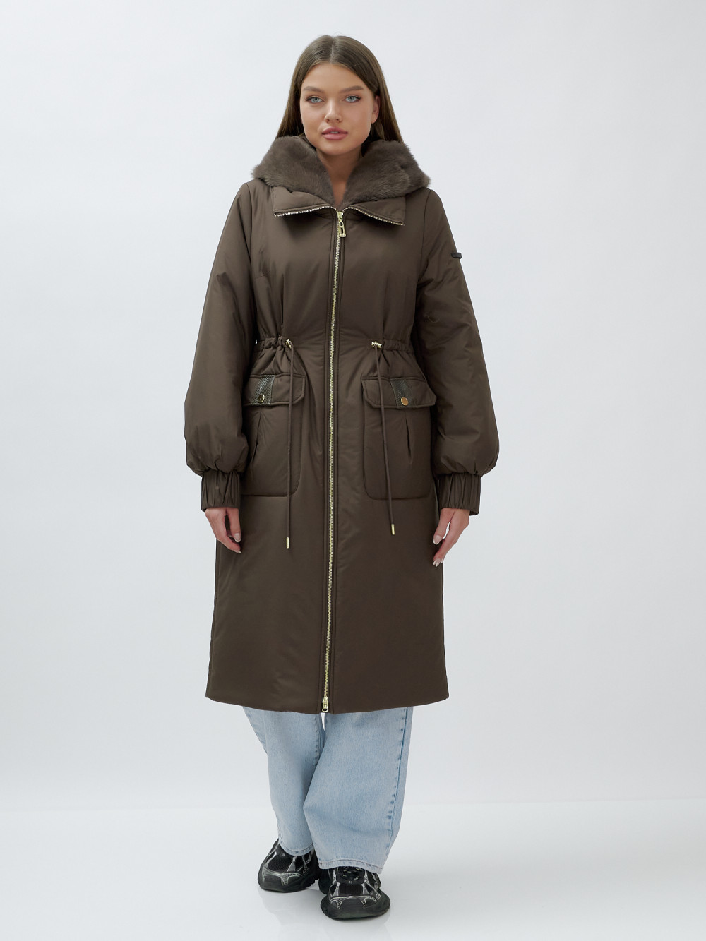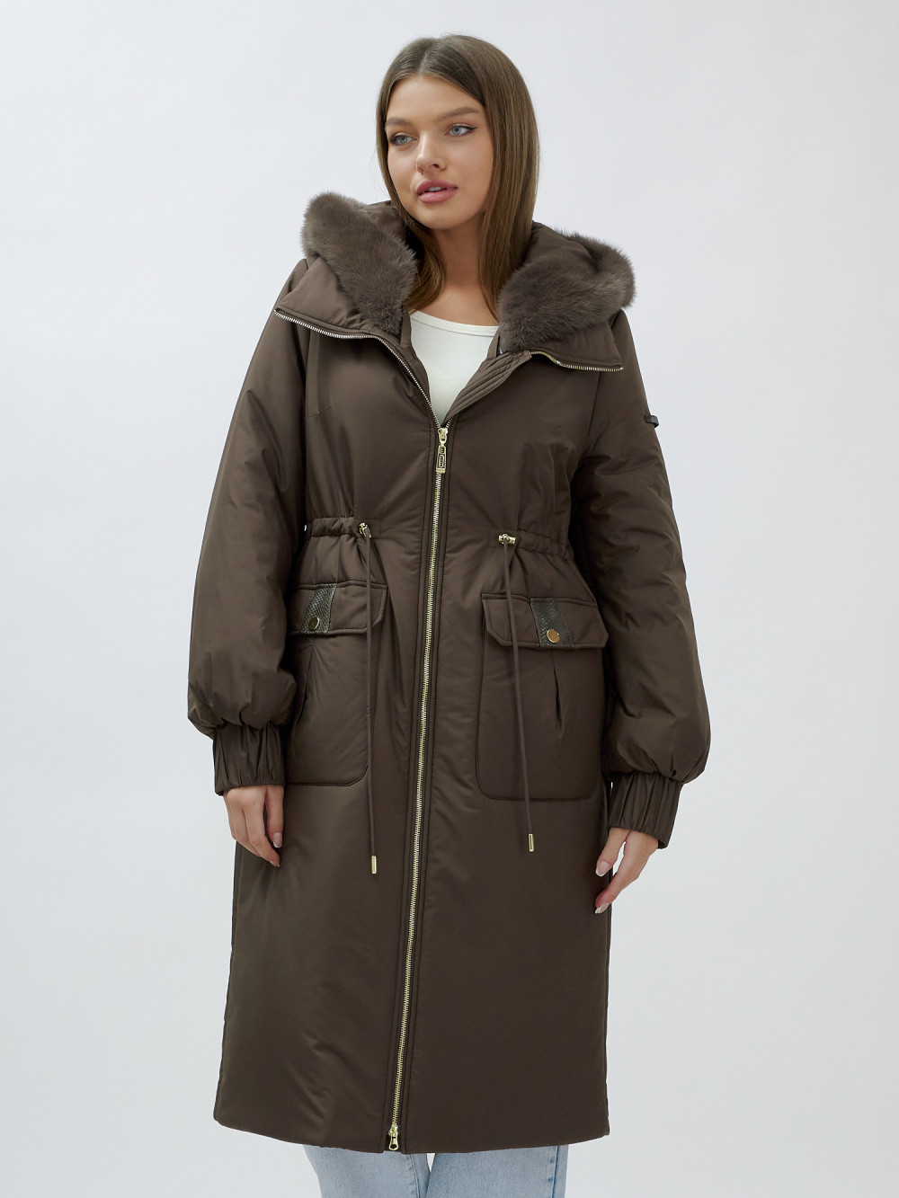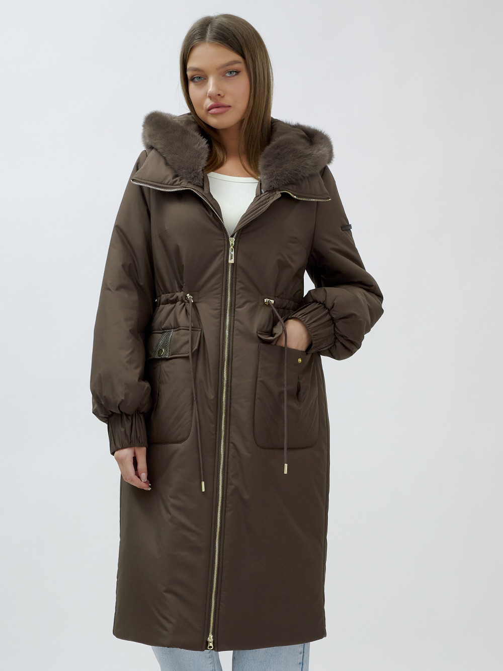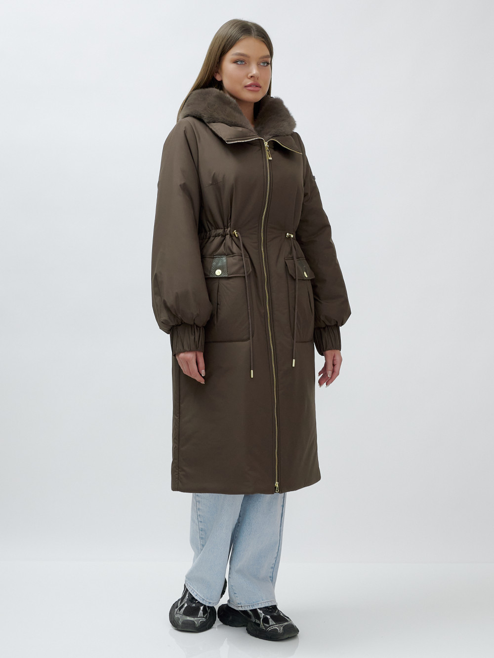 Пальто зимнее женское стильное с норкой люкс класса коричневого цвета 8628K — TORINNI