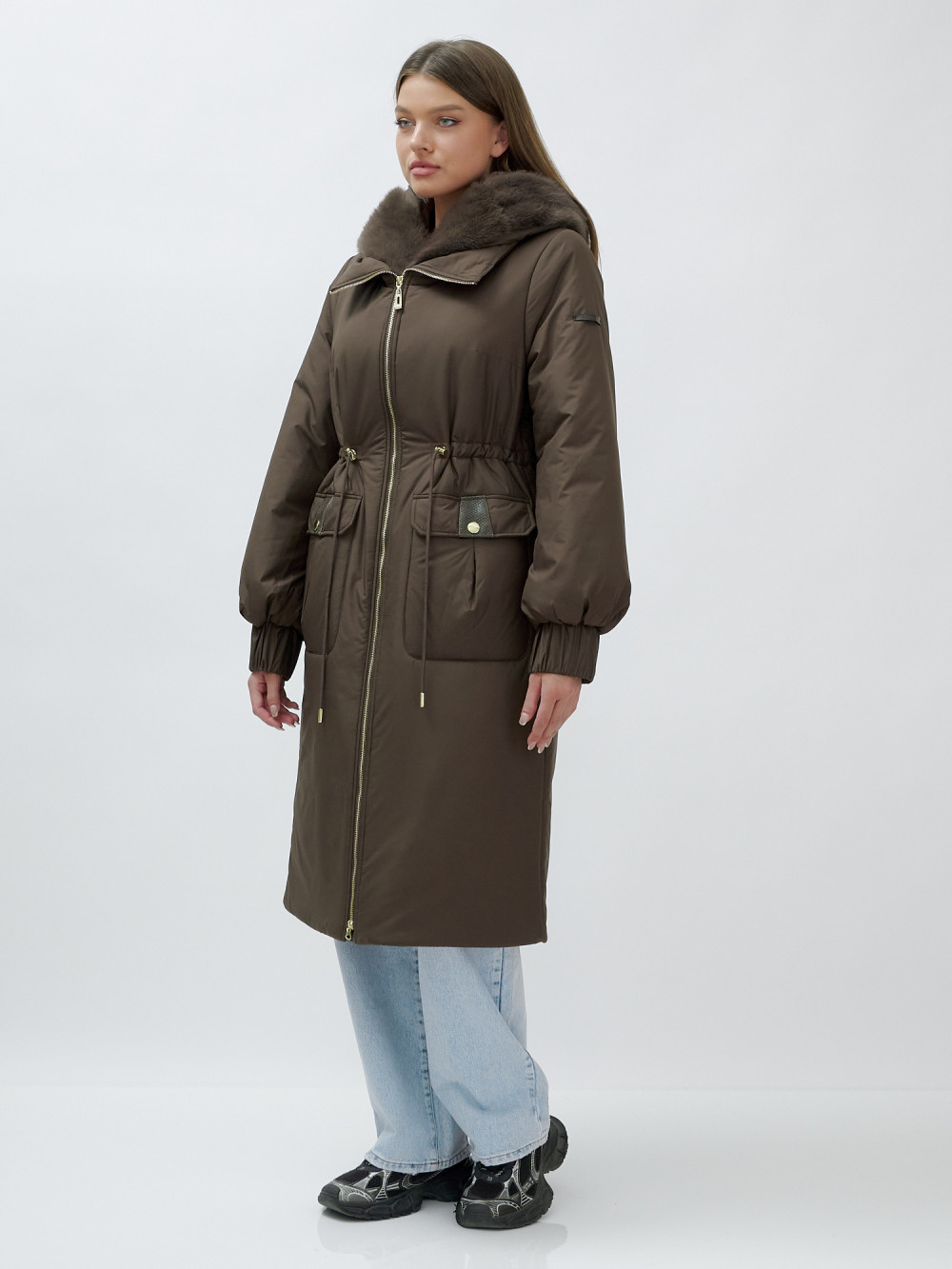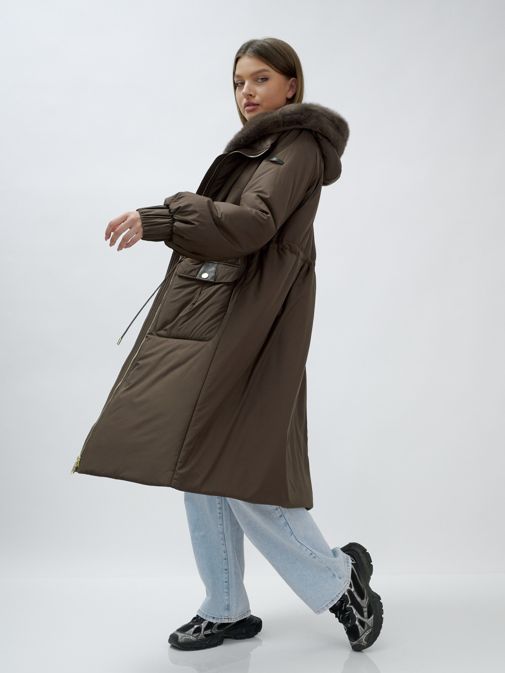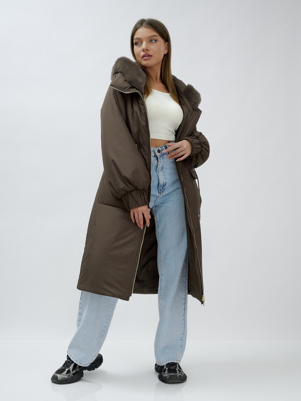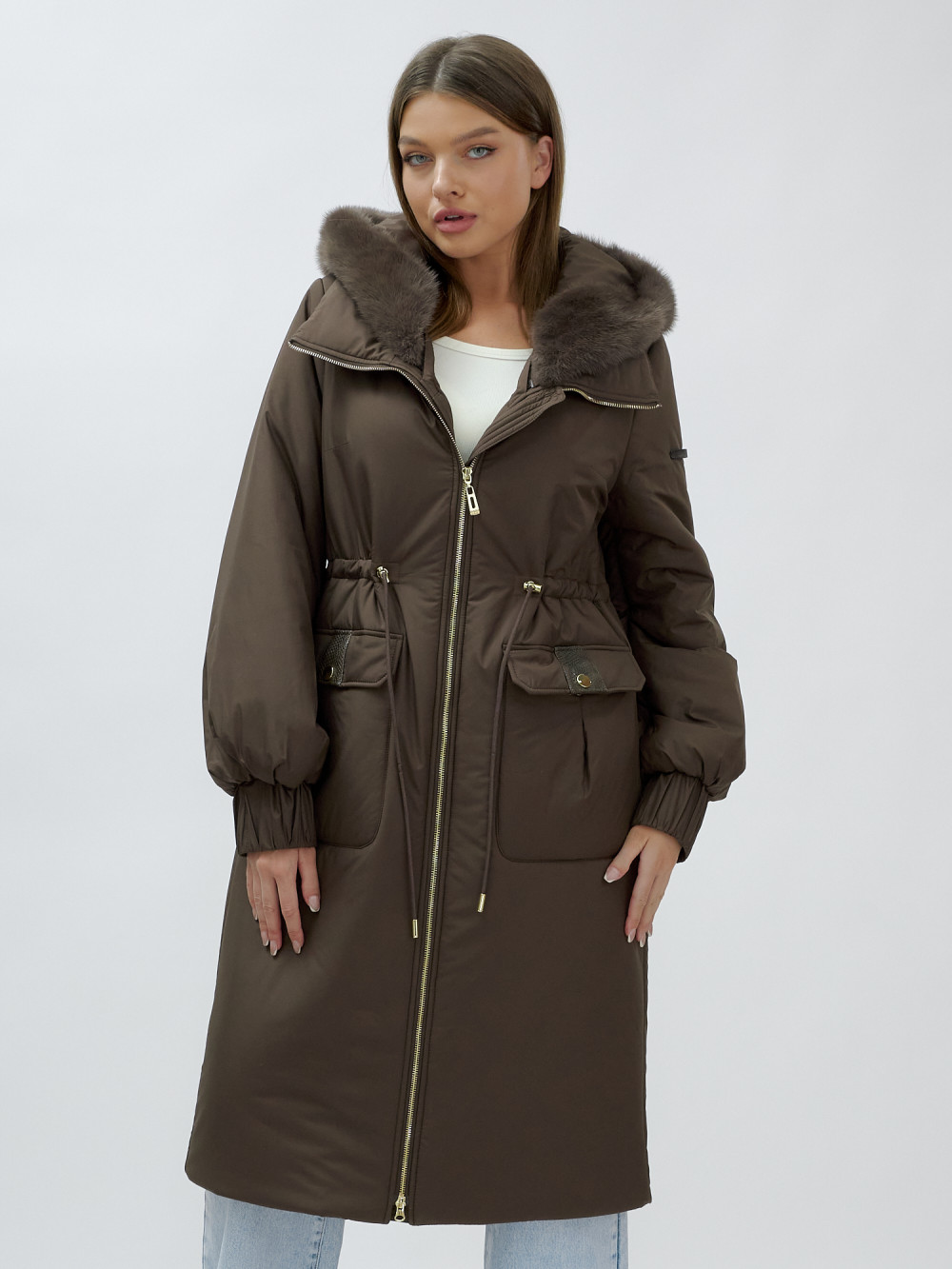 Пальто зимнее женское стильное с норкой люкс класса коричневого цвета 8628K — TORINNI