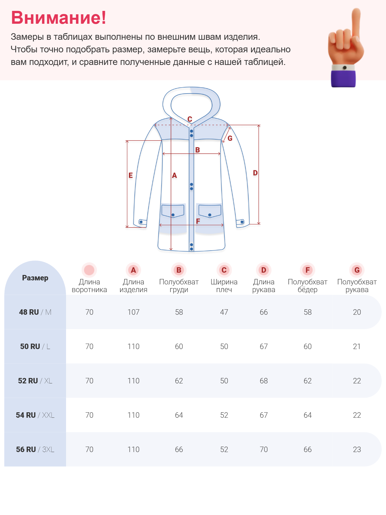 - Особенности модели: водоотталкивающий материал, гипоаллергенный материал, потайной карман, с начесом, с разрезом, ветрозащита
