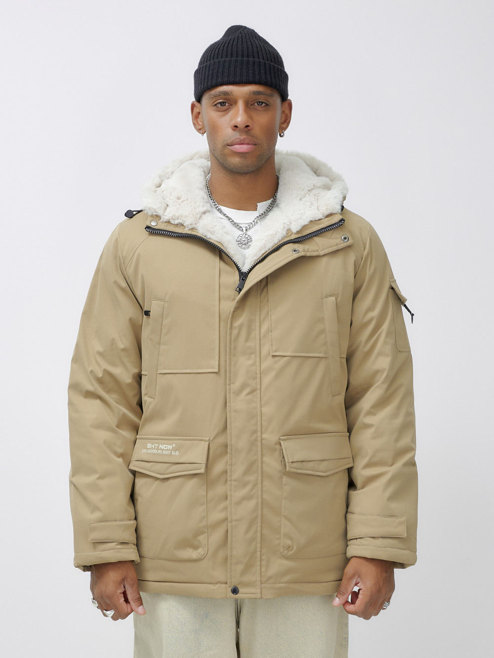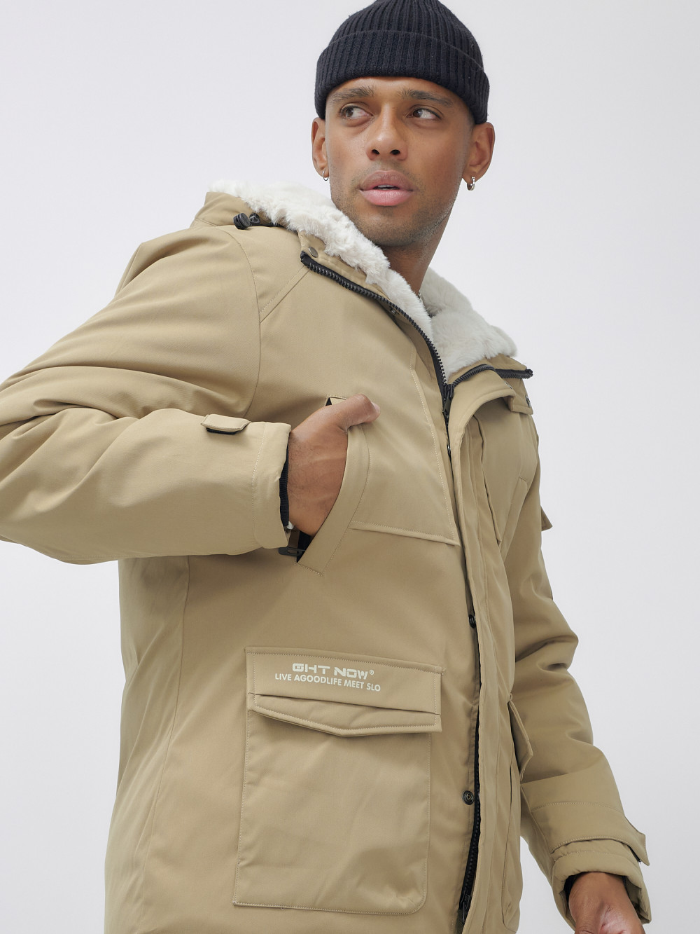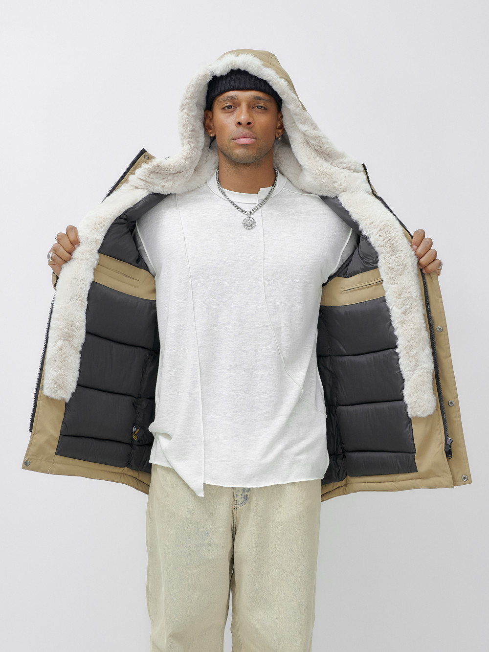 Парка мужская зимняя удлиненная с мехом горчичного цвета 8751G