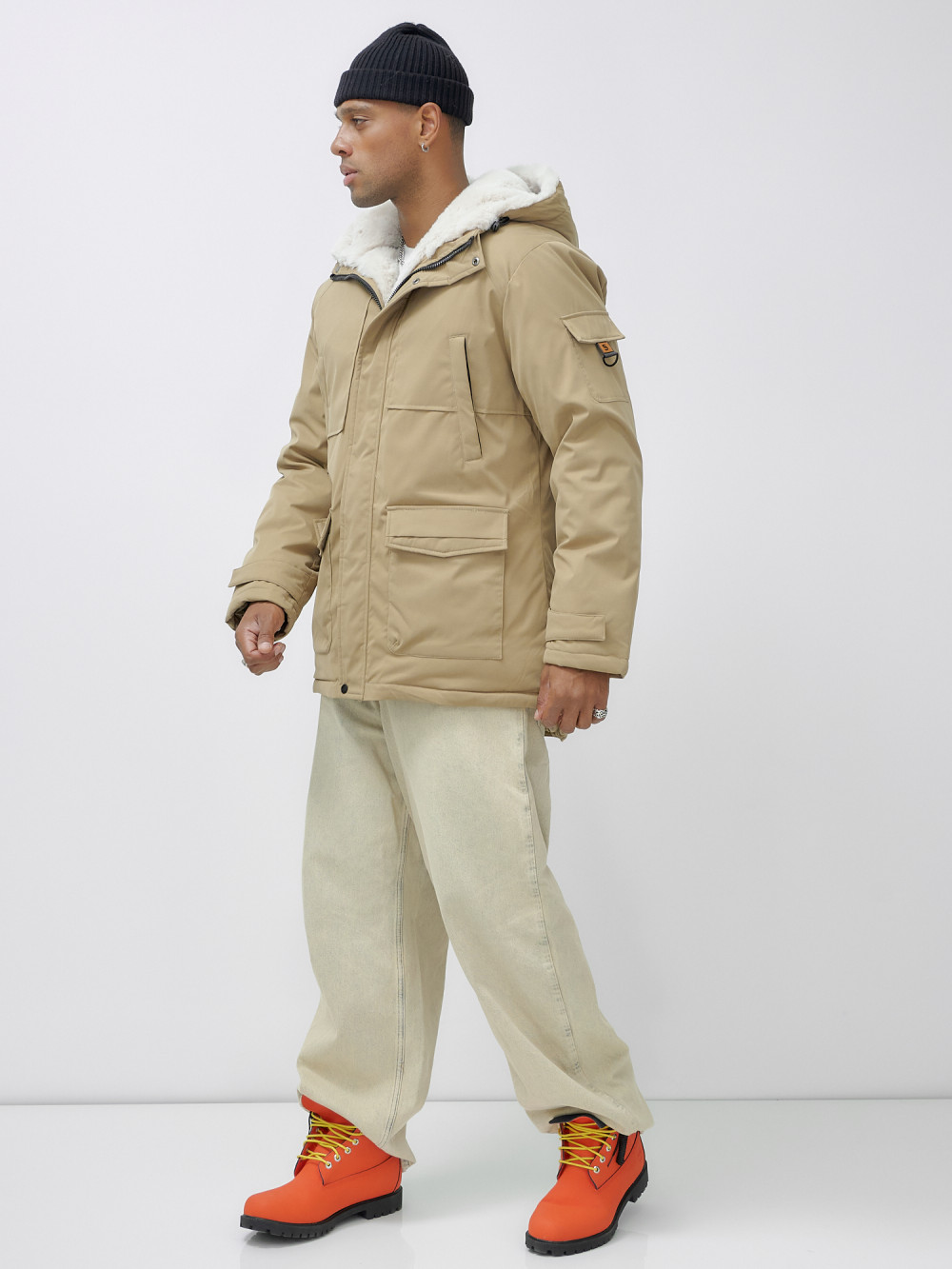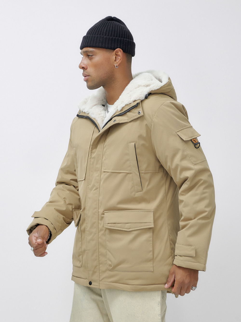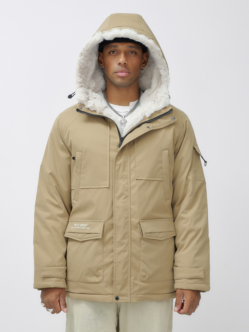 Парка мужская зимняя удлиненная с мехом горчичного цвета 8751G