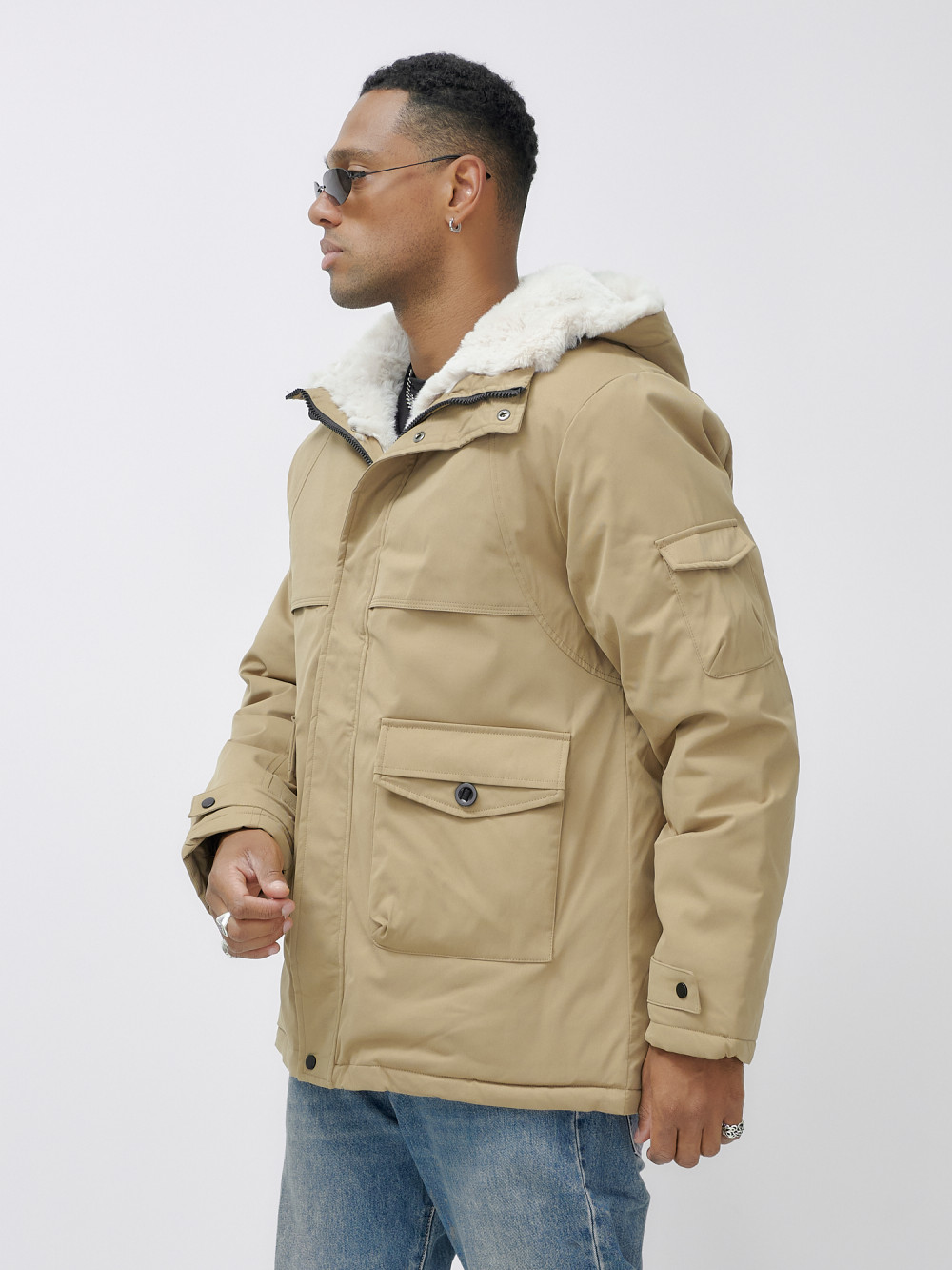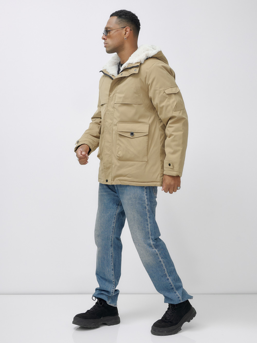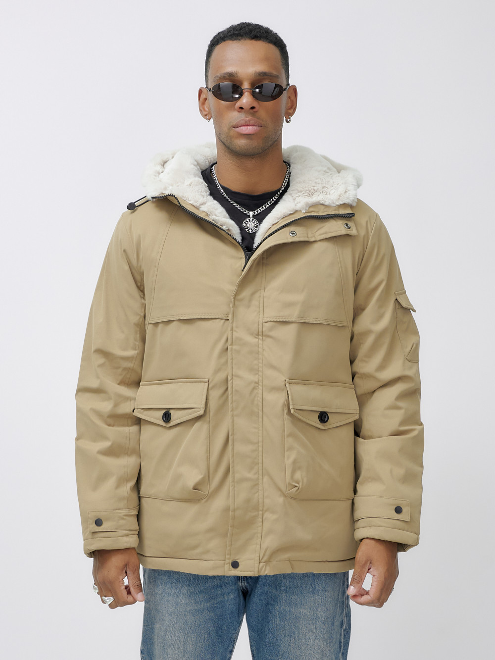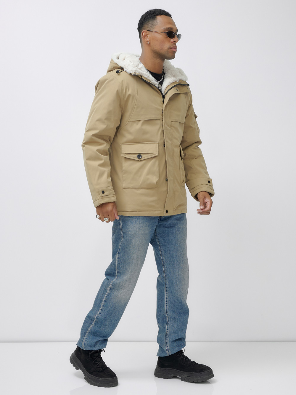 Парка мужская зимняя удлиненная с мехом горчичного цвета 8757G