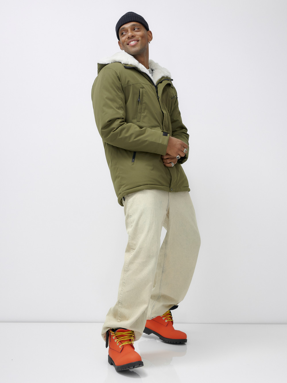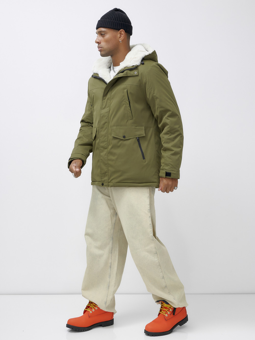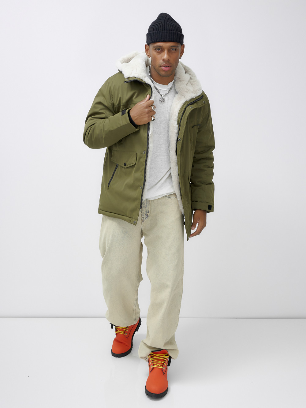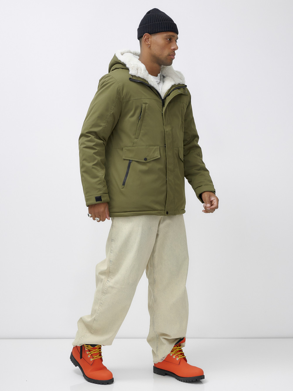 Парка мужская зимняя удлиненная с мехом хаки цвета 8755Kh