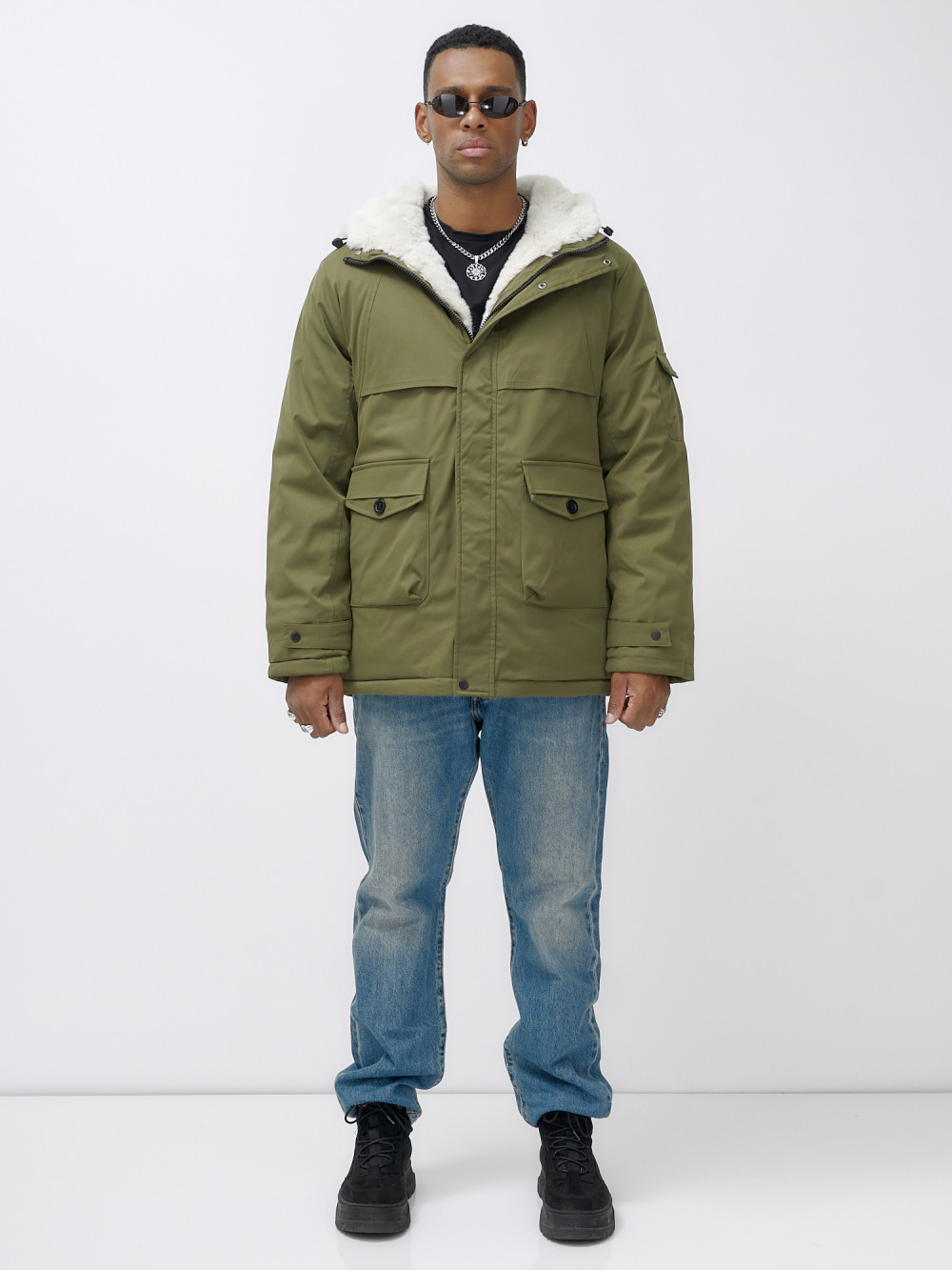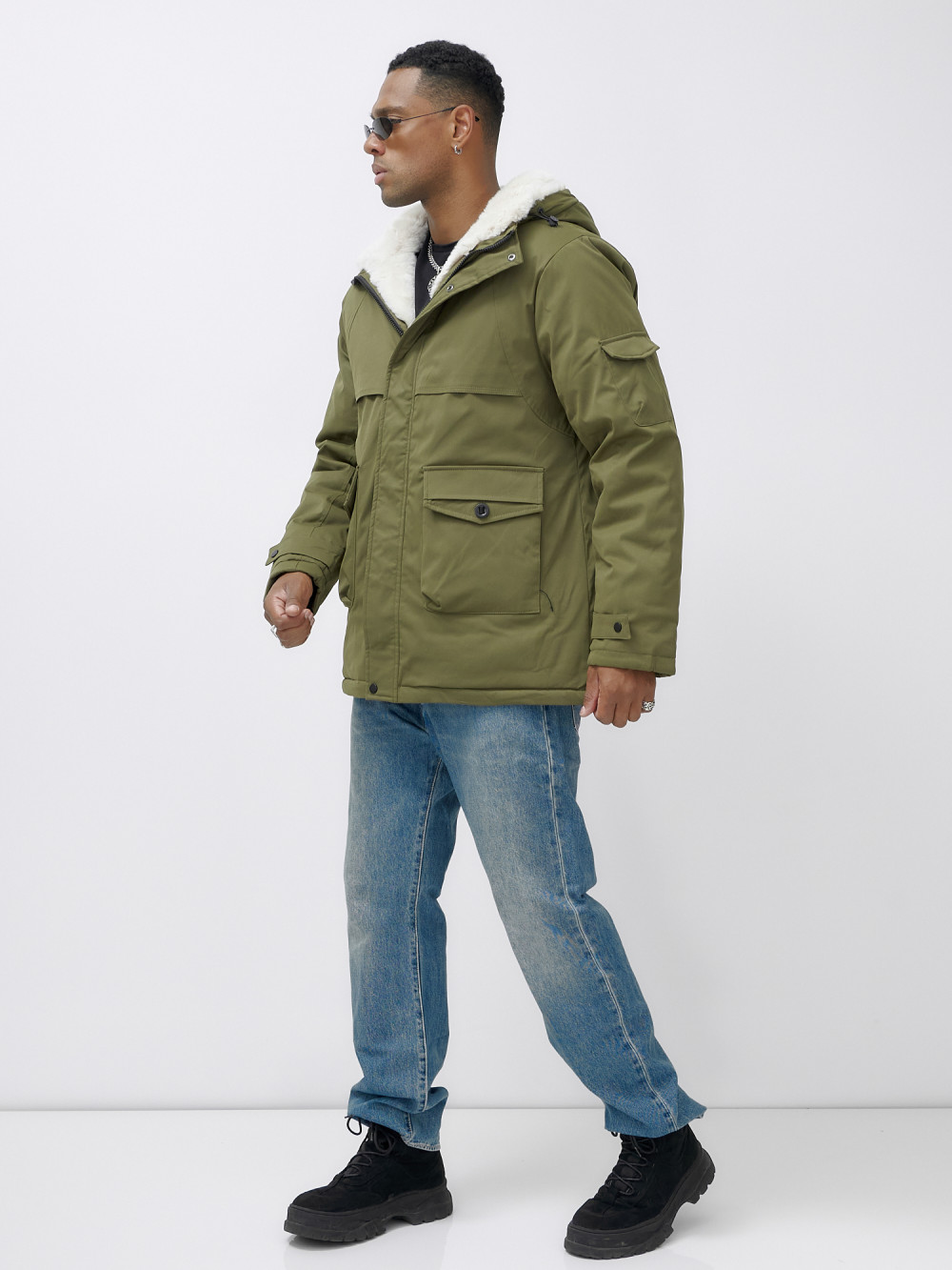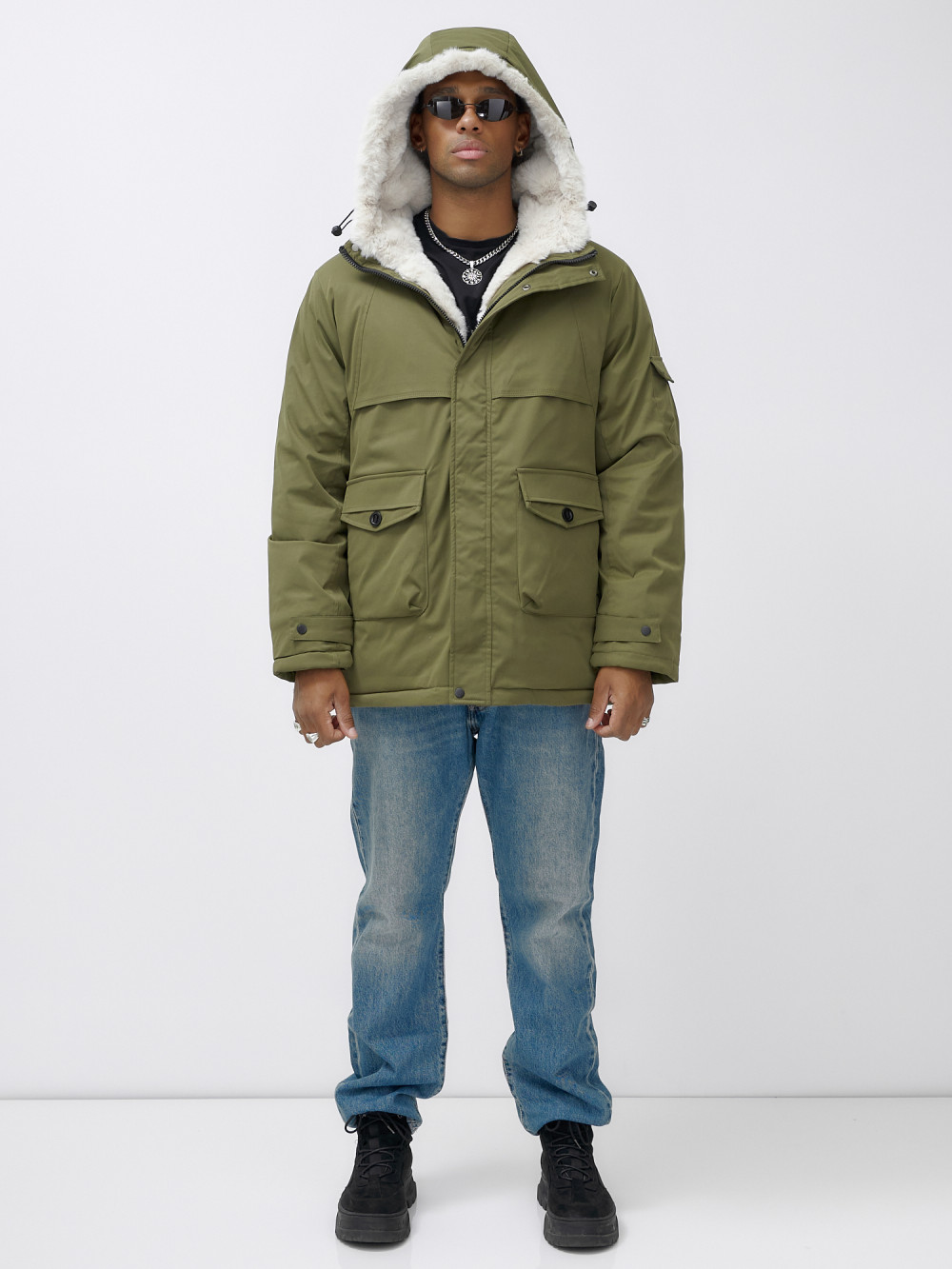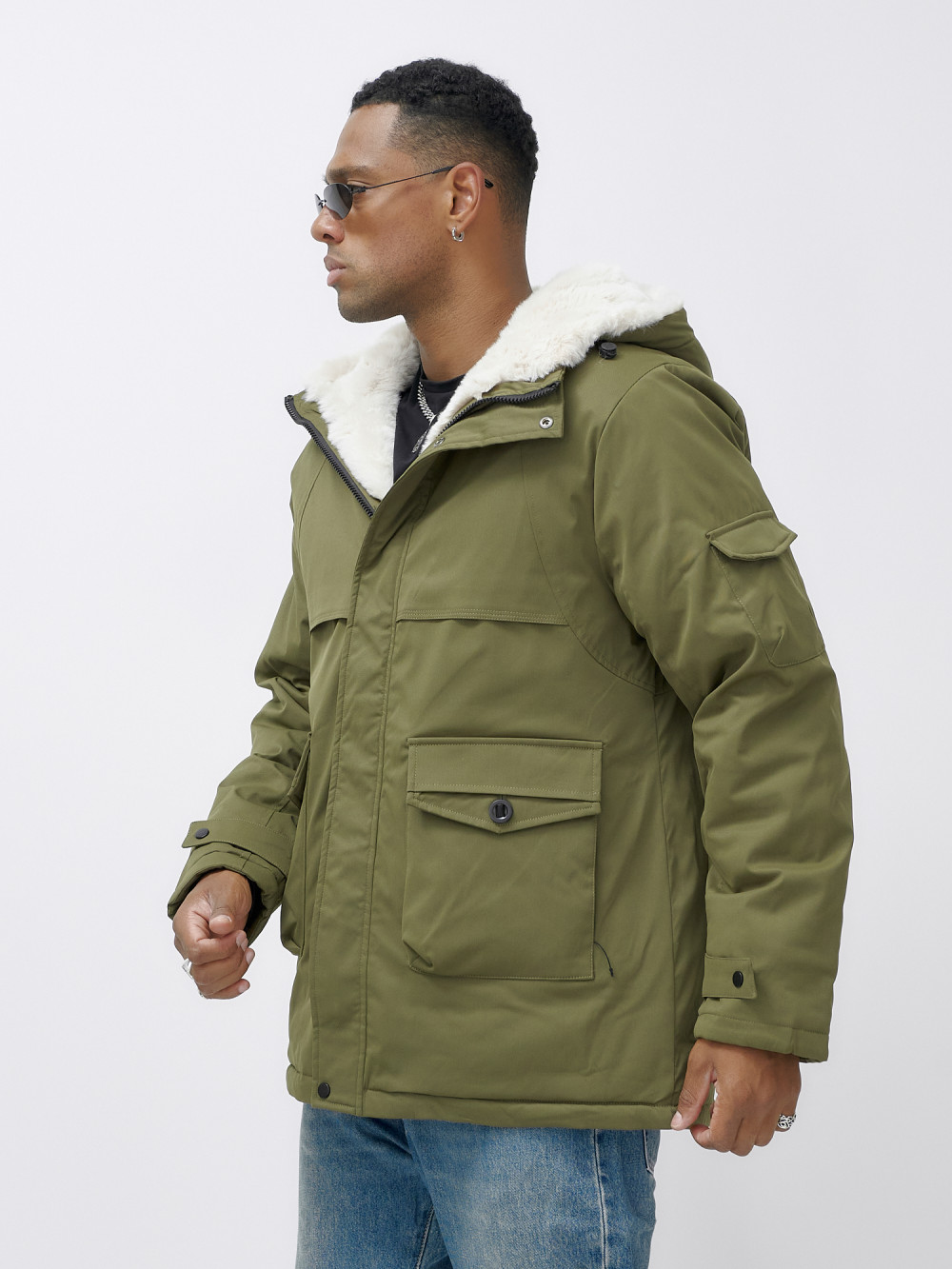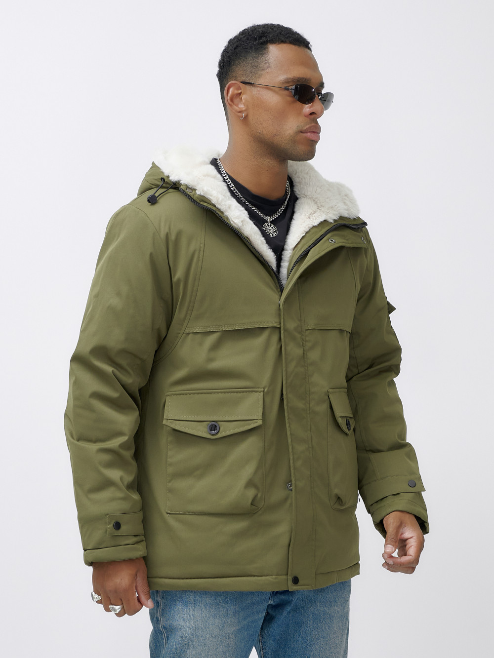 Парка мужская зимняя удлиненная с мехом хаки цвета 8757Kh