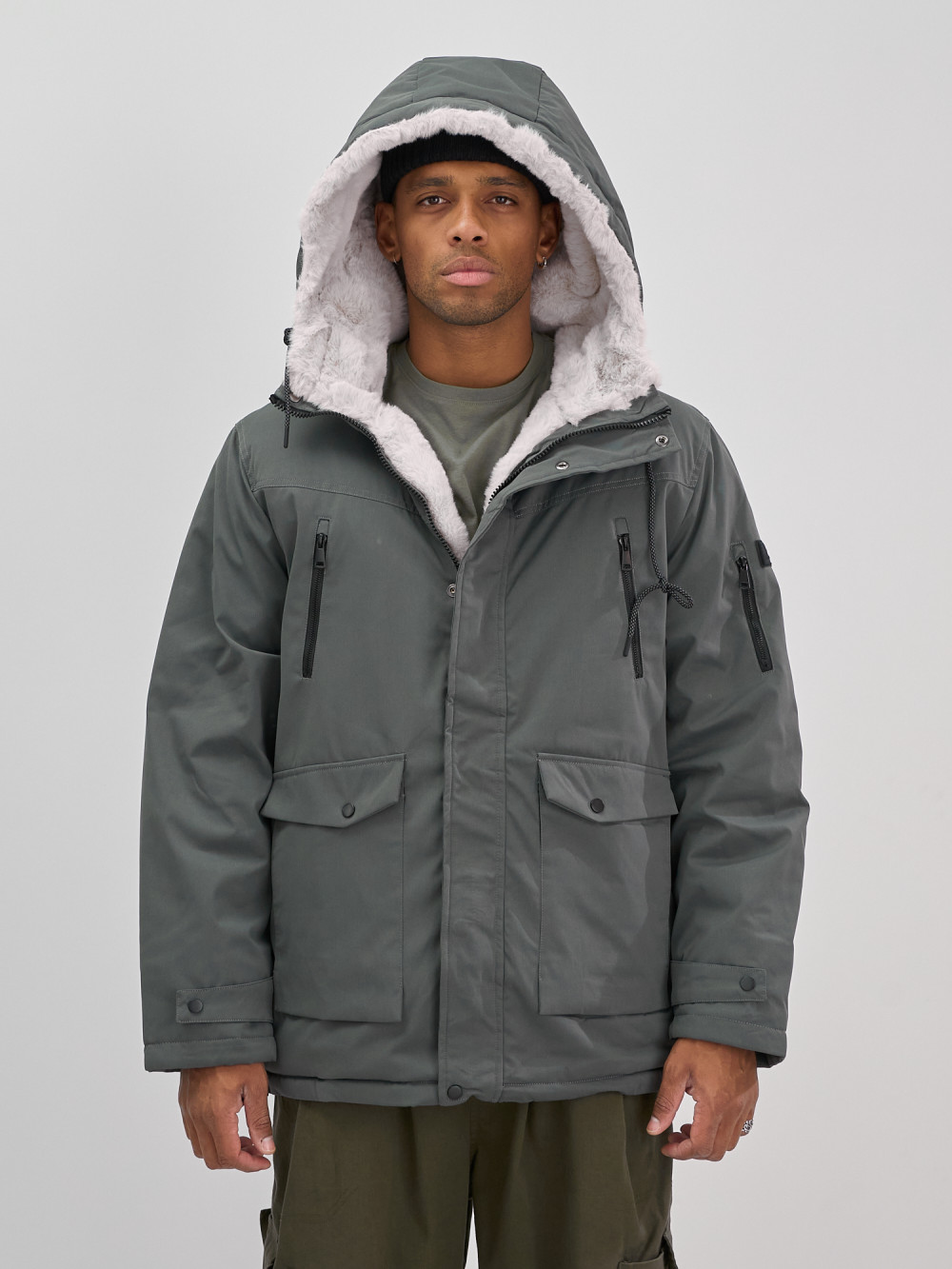 Парка мужская зимняя удлиненная с мехом серого цвета 8761Sr — MG