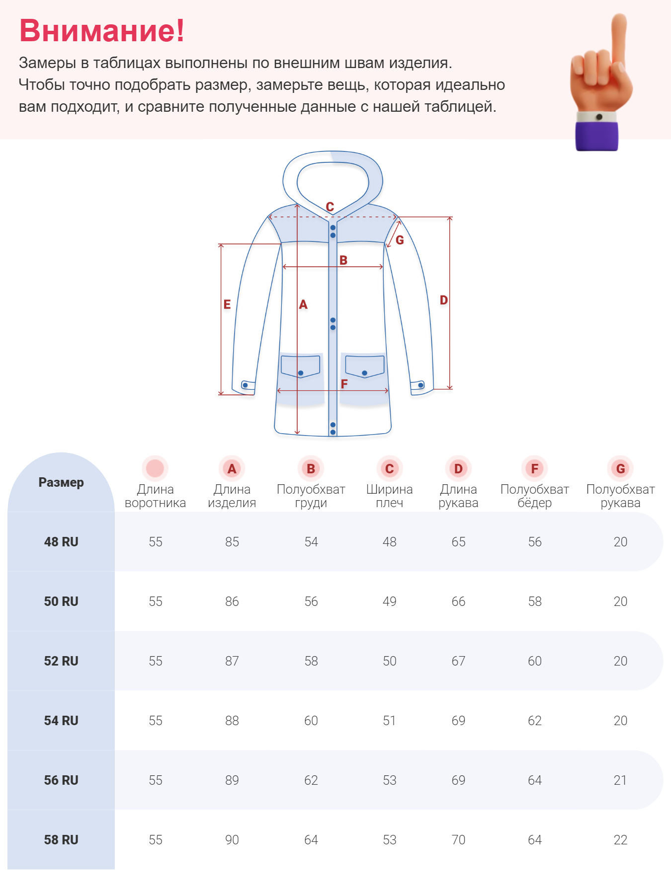 - Особенности модели: дышащий материал, ветрозащита, водоотталкивающий материал, гипоаллергенный материал, с начесом, съемная опушка