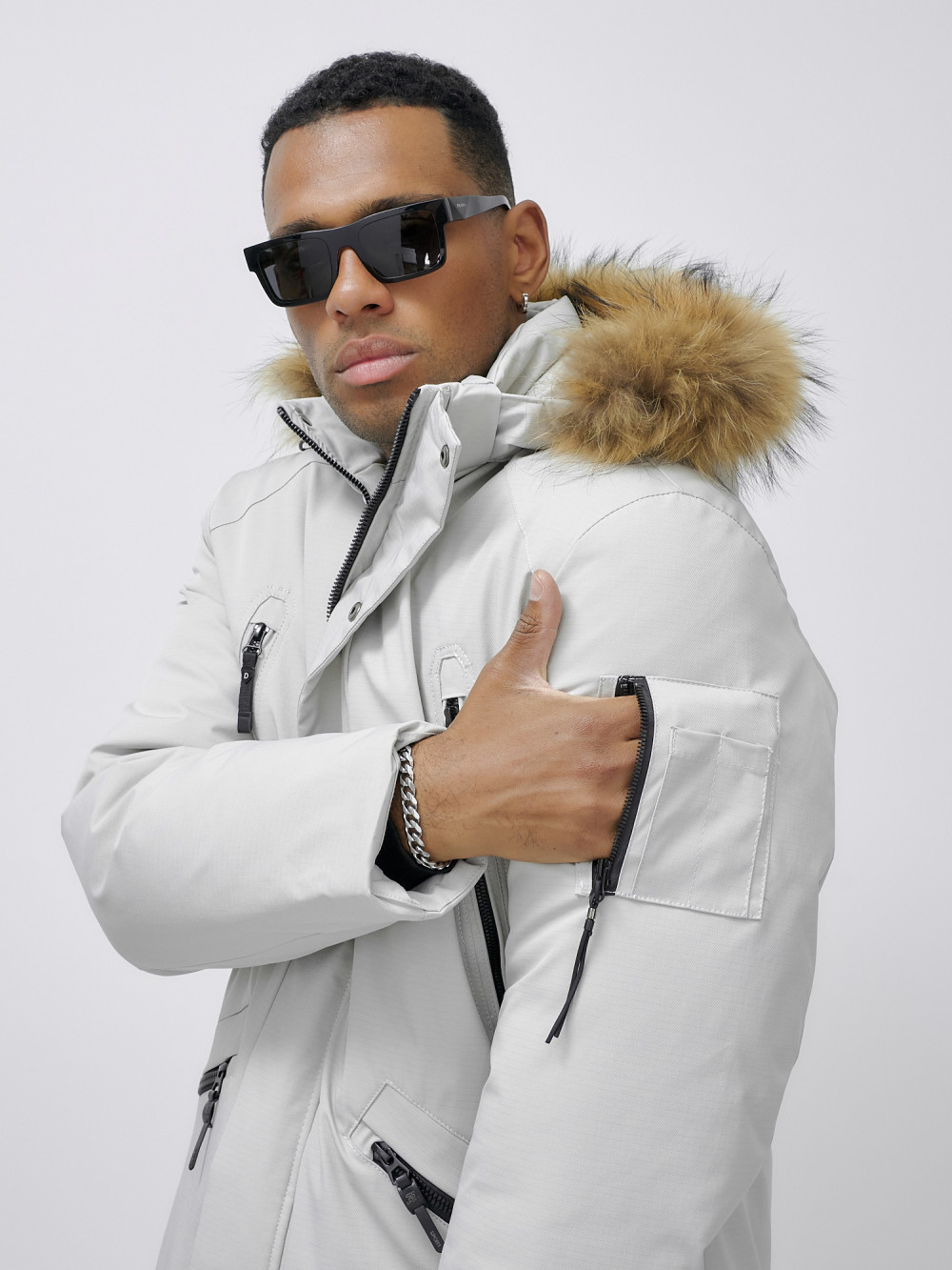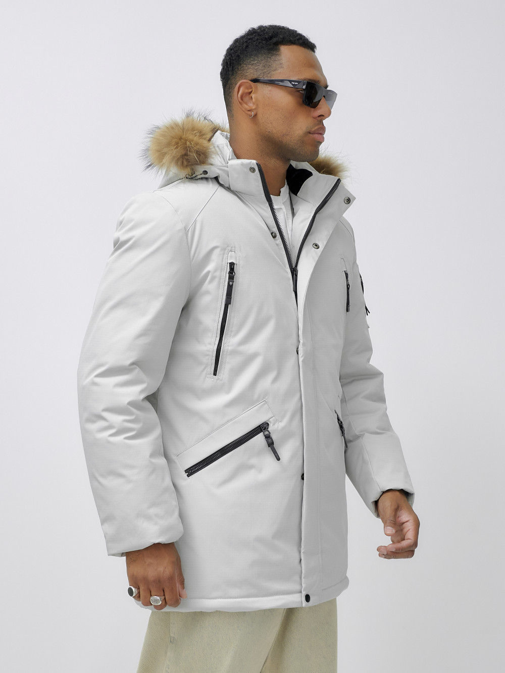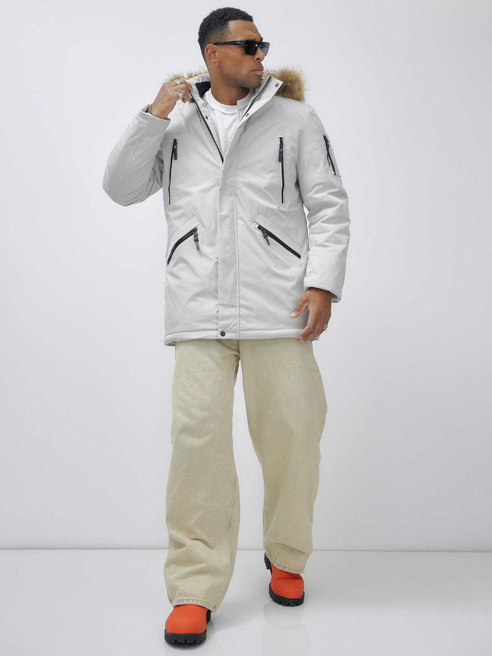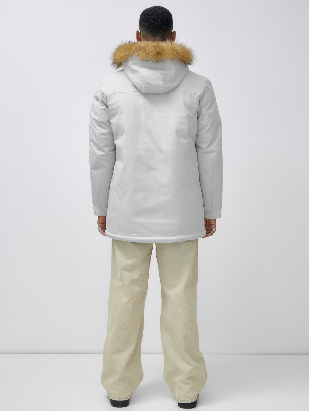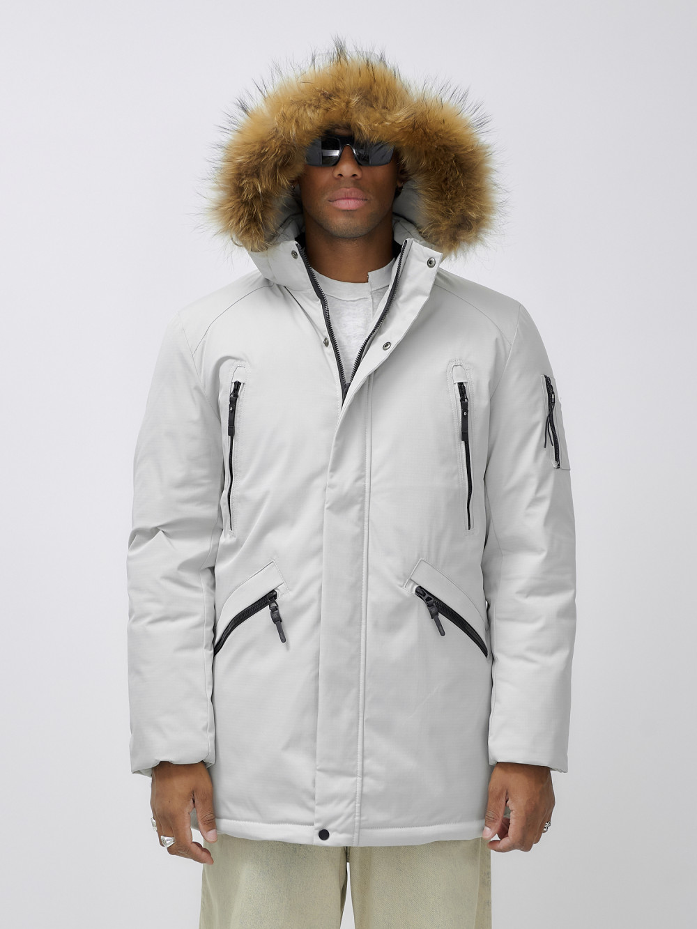 Парка мужская зимняя удлиненная с мехом светло-серого цвета 606_1SS