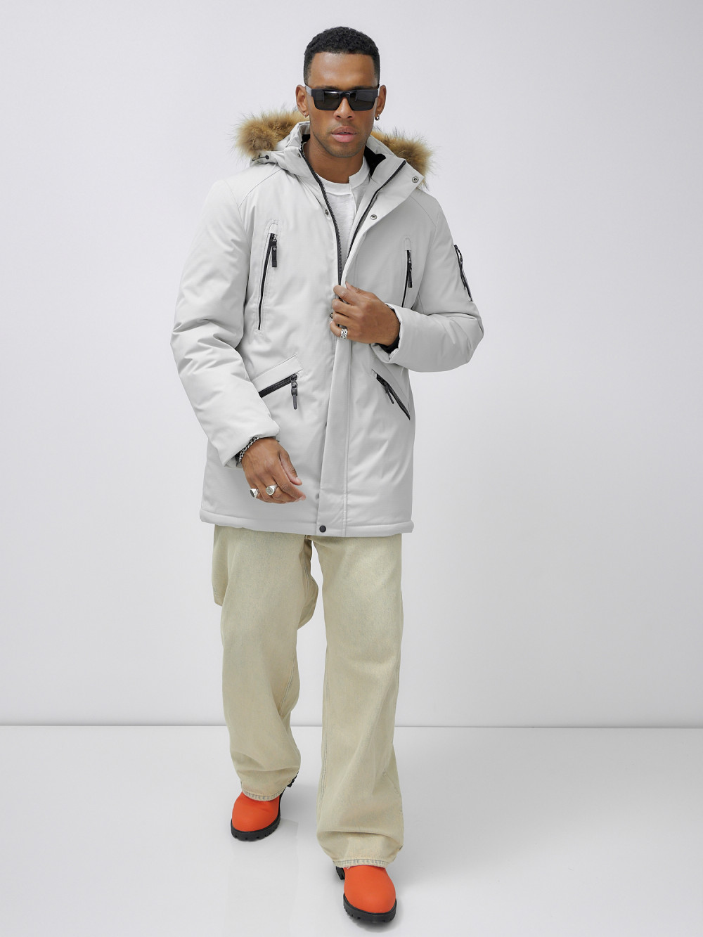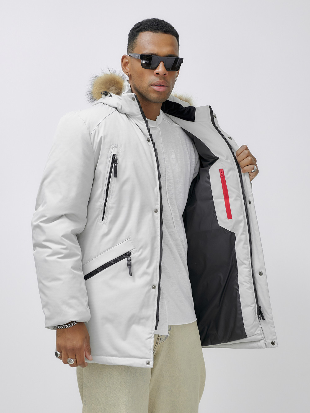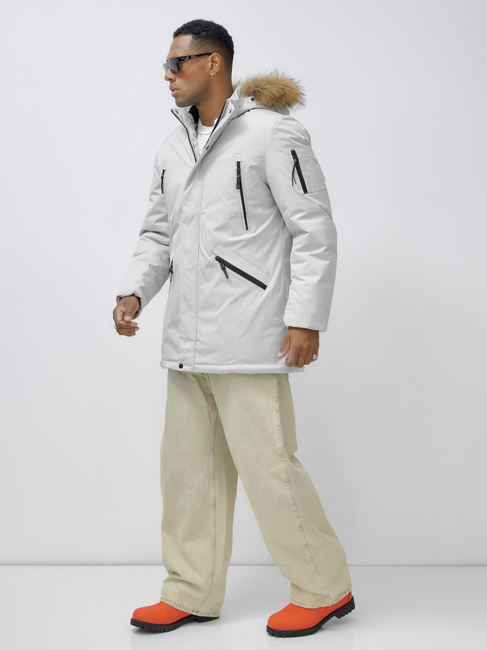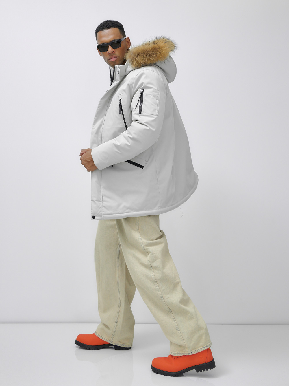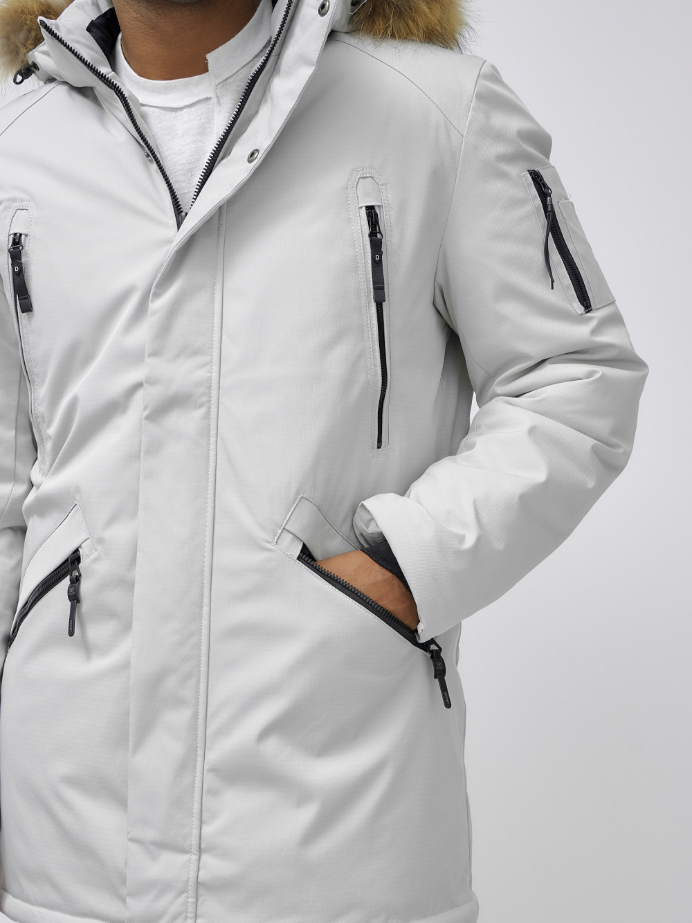 Парка мужская зимняя удлиненная с мехом светло-серого цвета 606_1SS