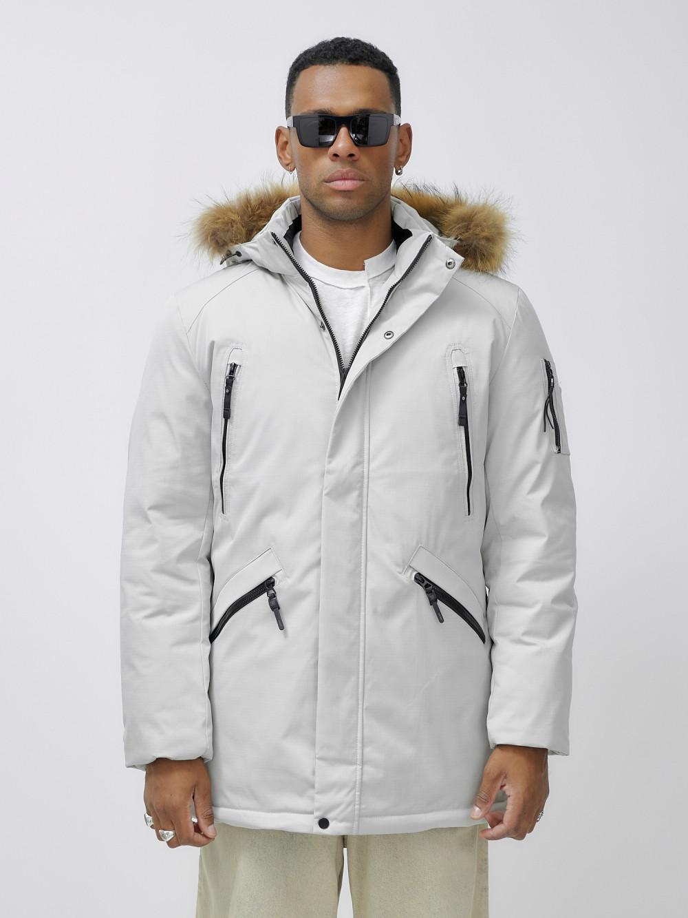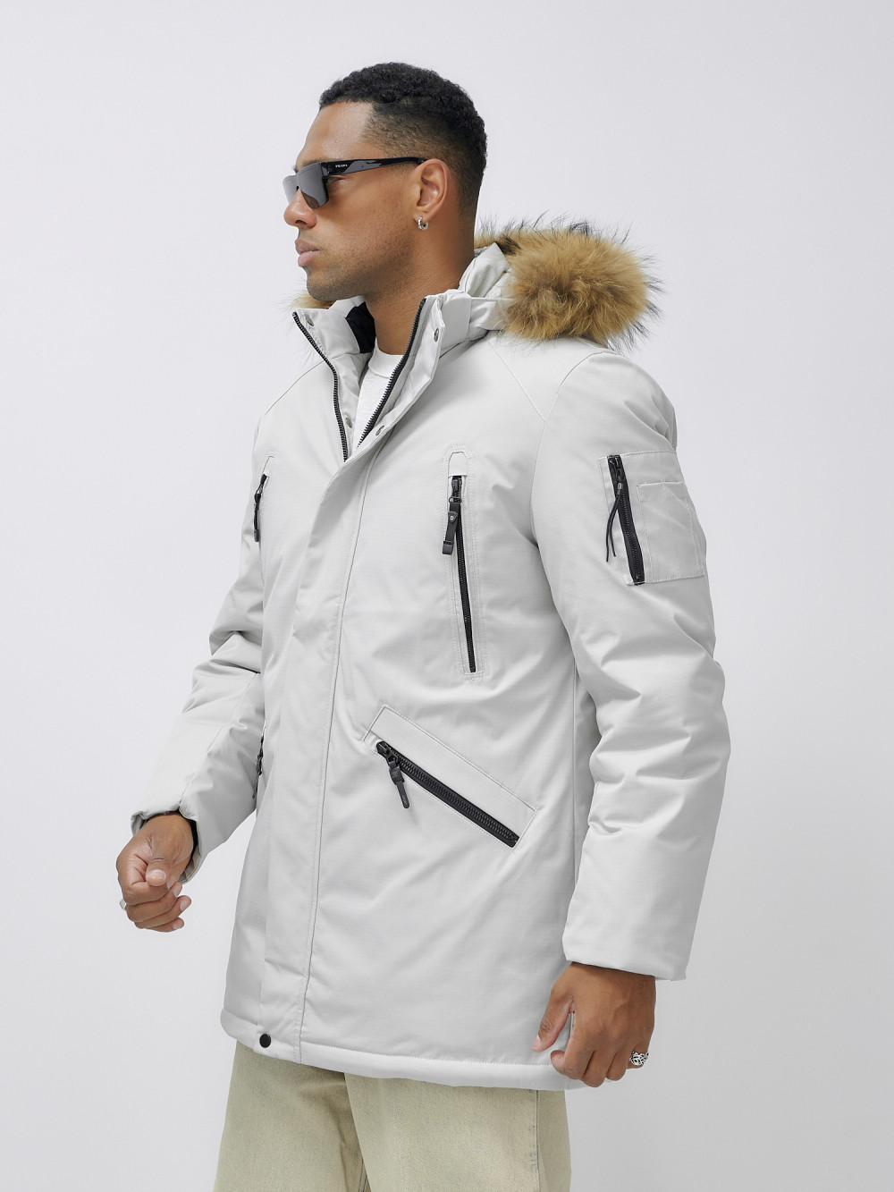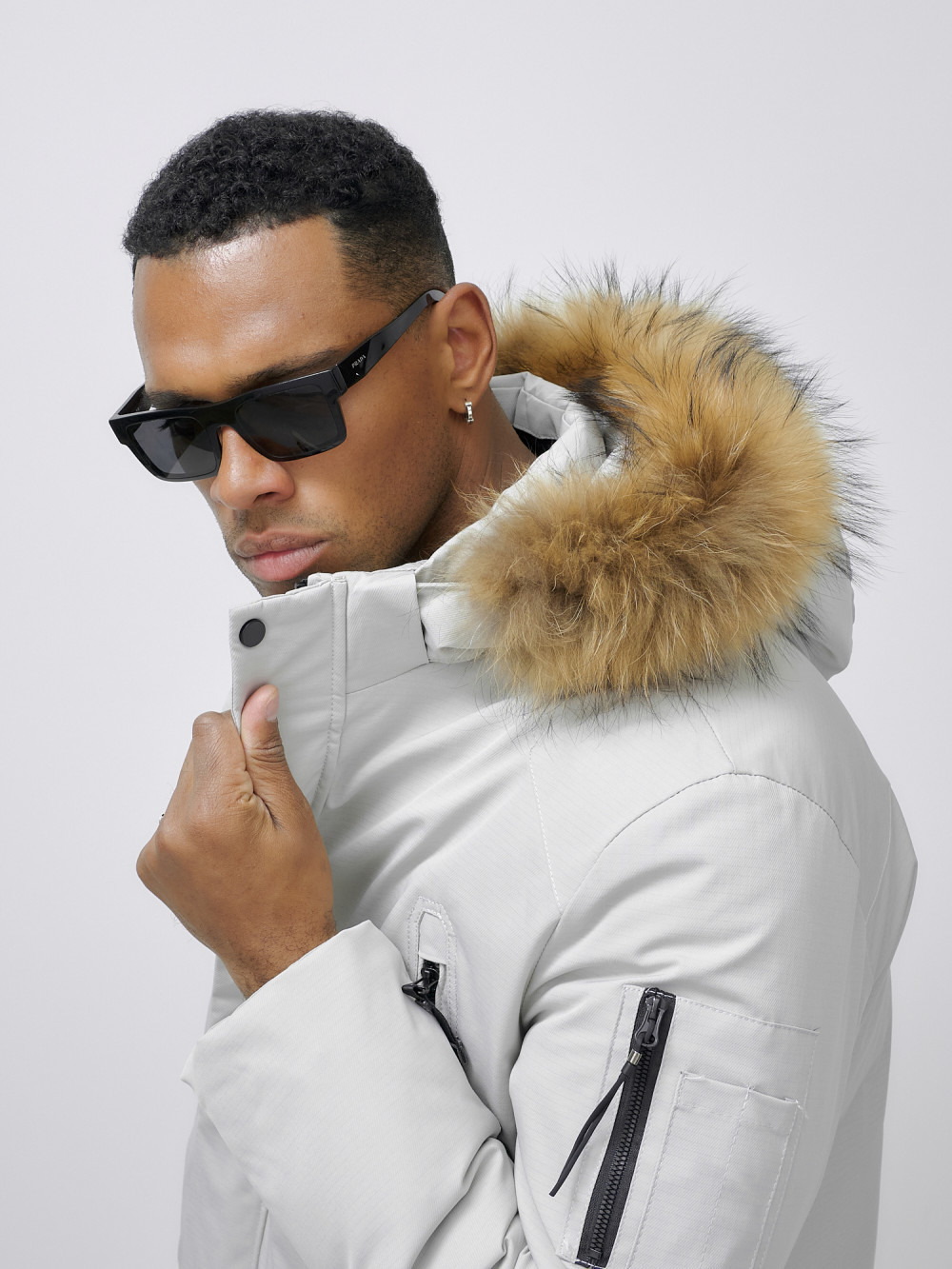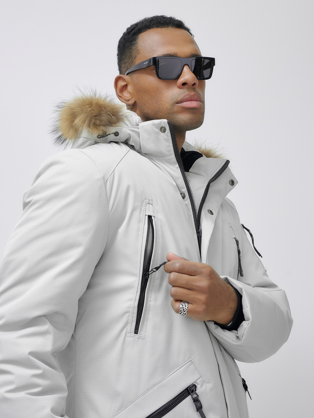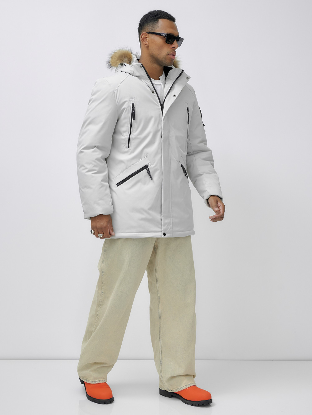 Парка мужская зимняя удлиненная с мехом светло-серого цвета 606_1SS
