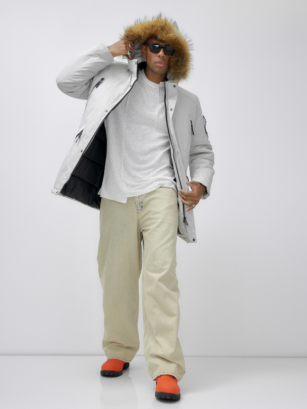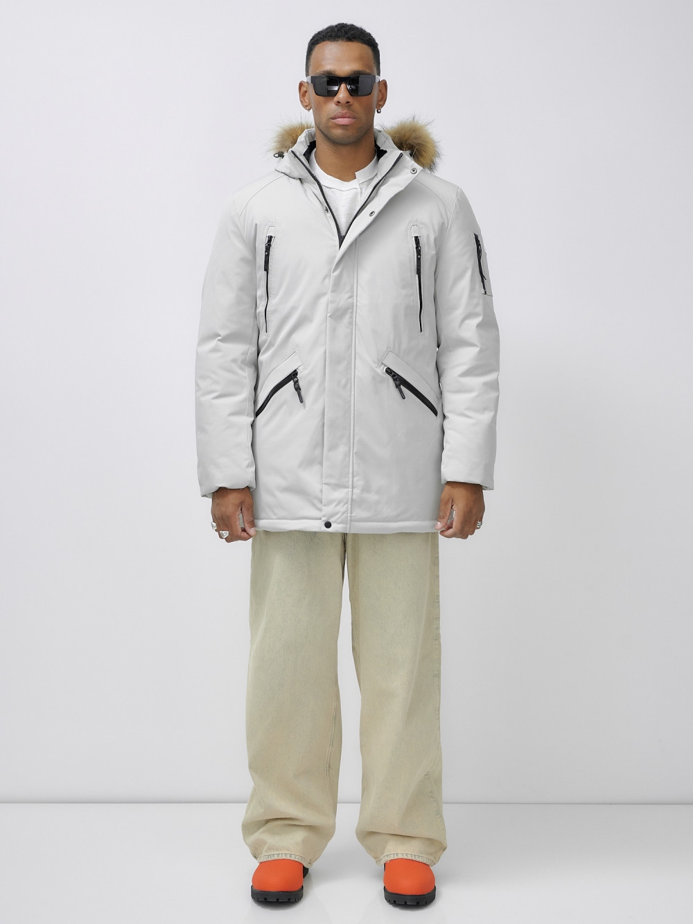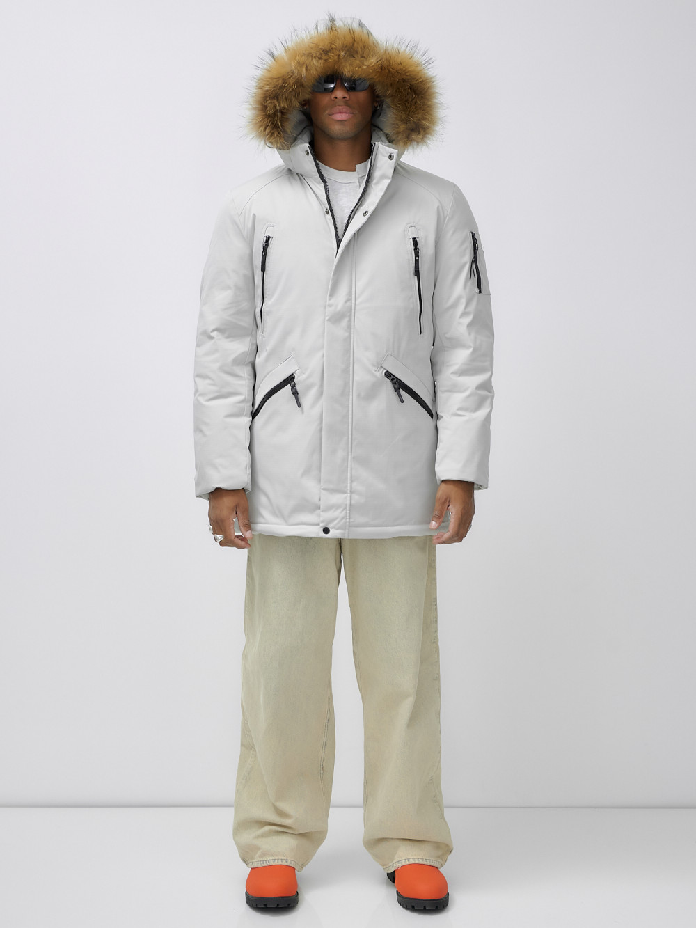 Парка мужская зимняя удлиненная с мехом светло-серого цвета 606_1SS — WONDERRMAN
