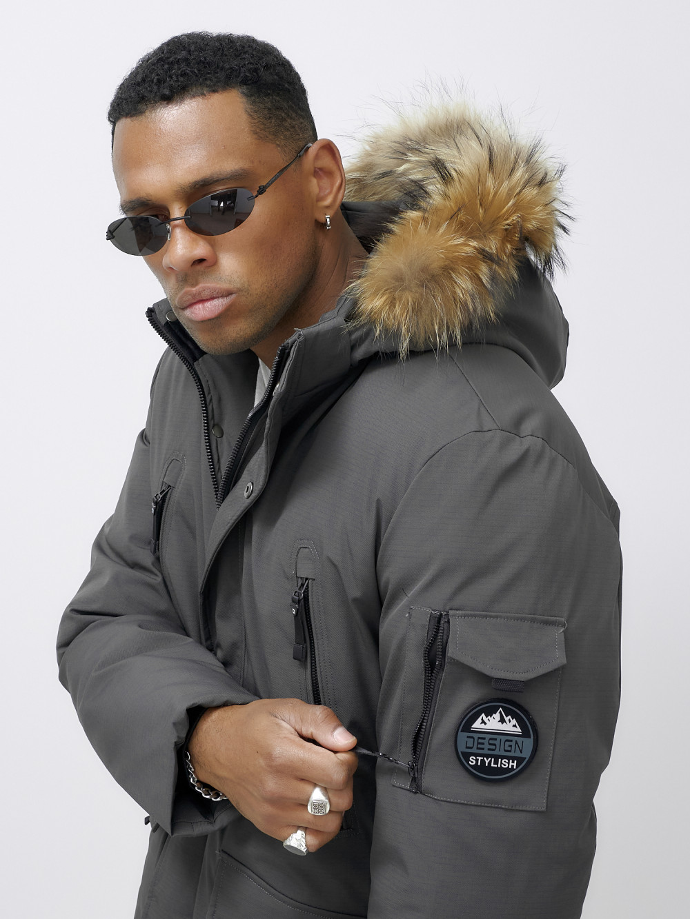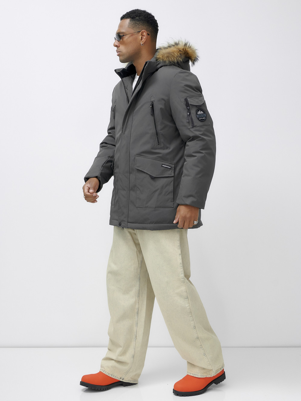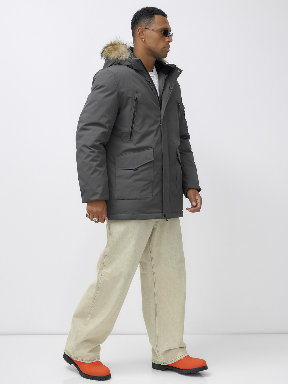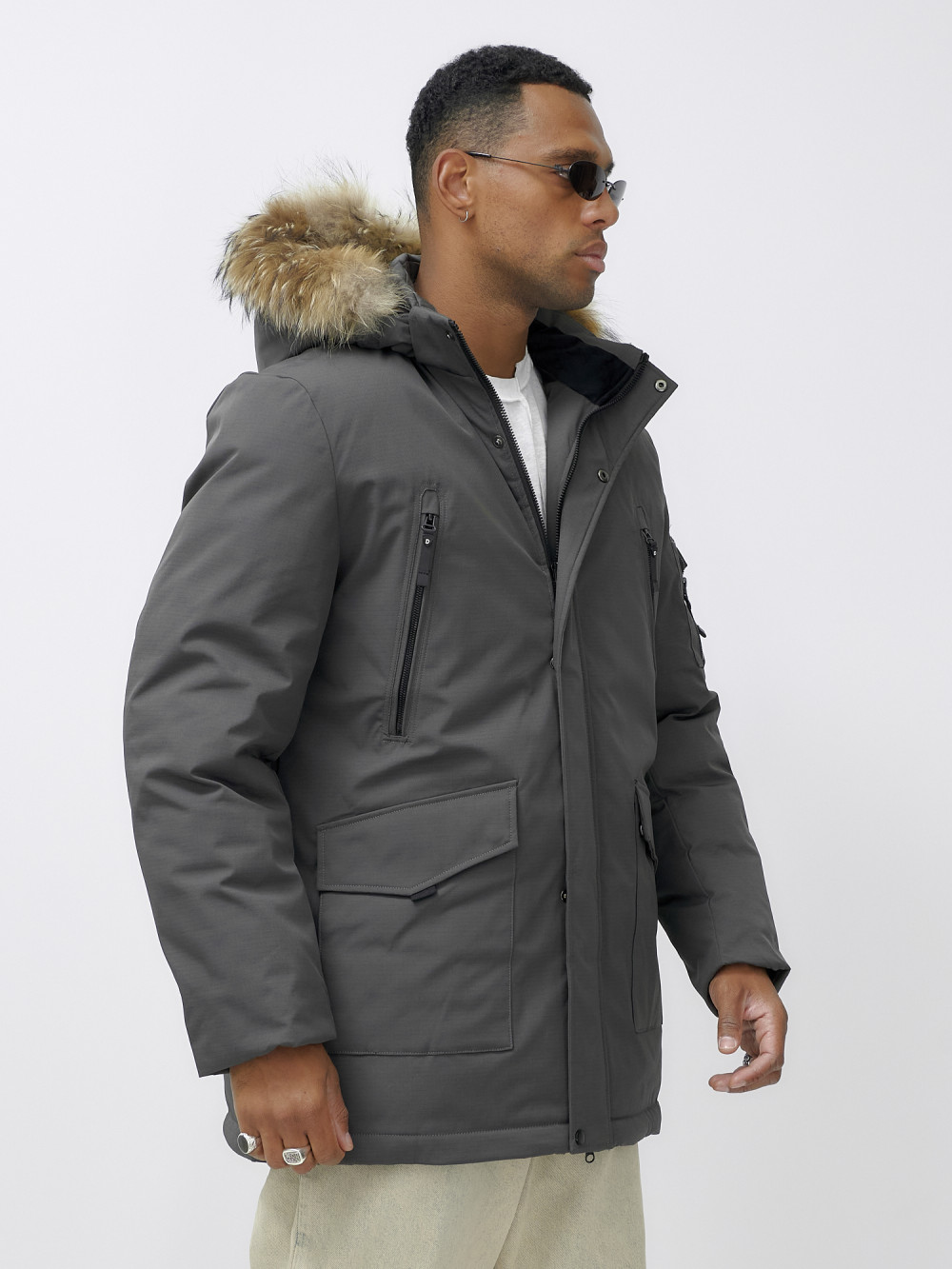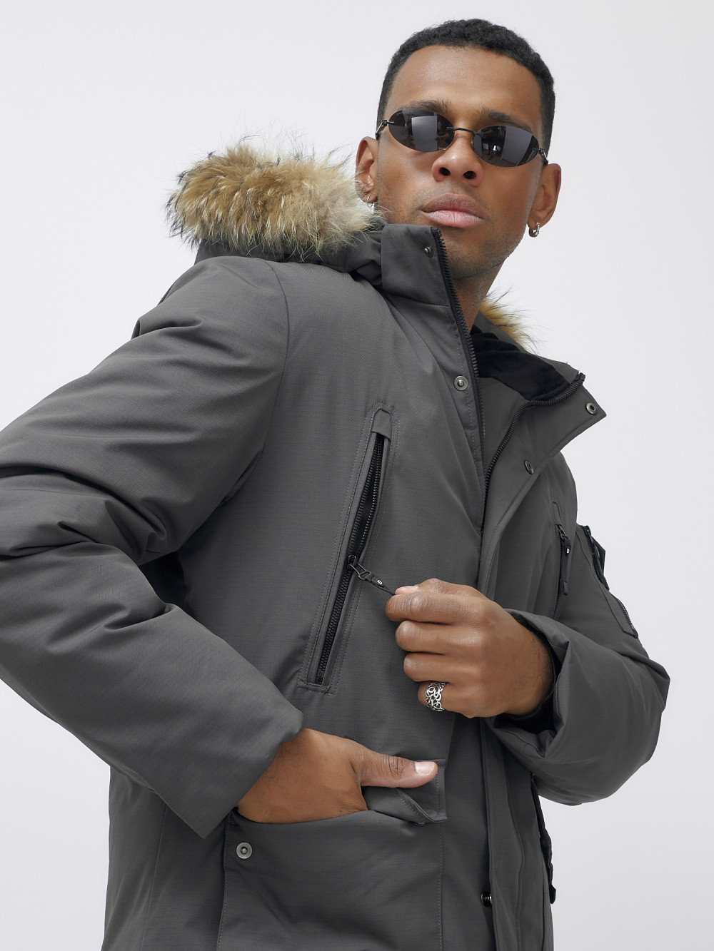 Парка мужская зимняя удлиненная с мехом темно-серого цвета 602_1TC