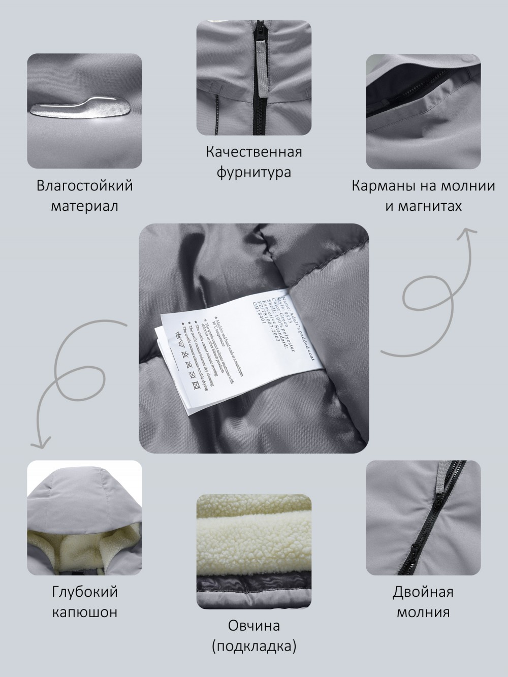 - Декоративные элементы: Капюшон, Карманы, Манжеты, Пояс/ремень
