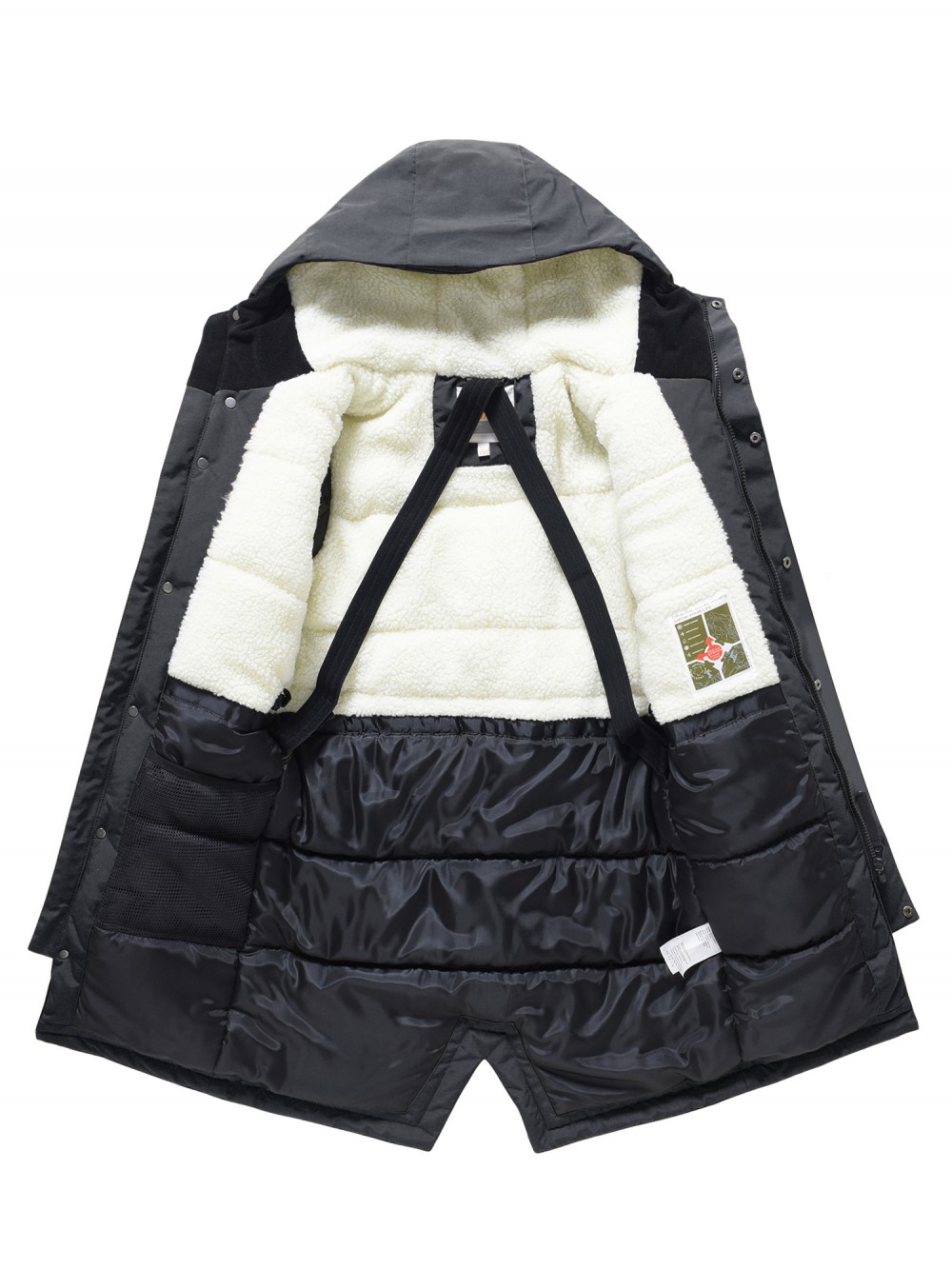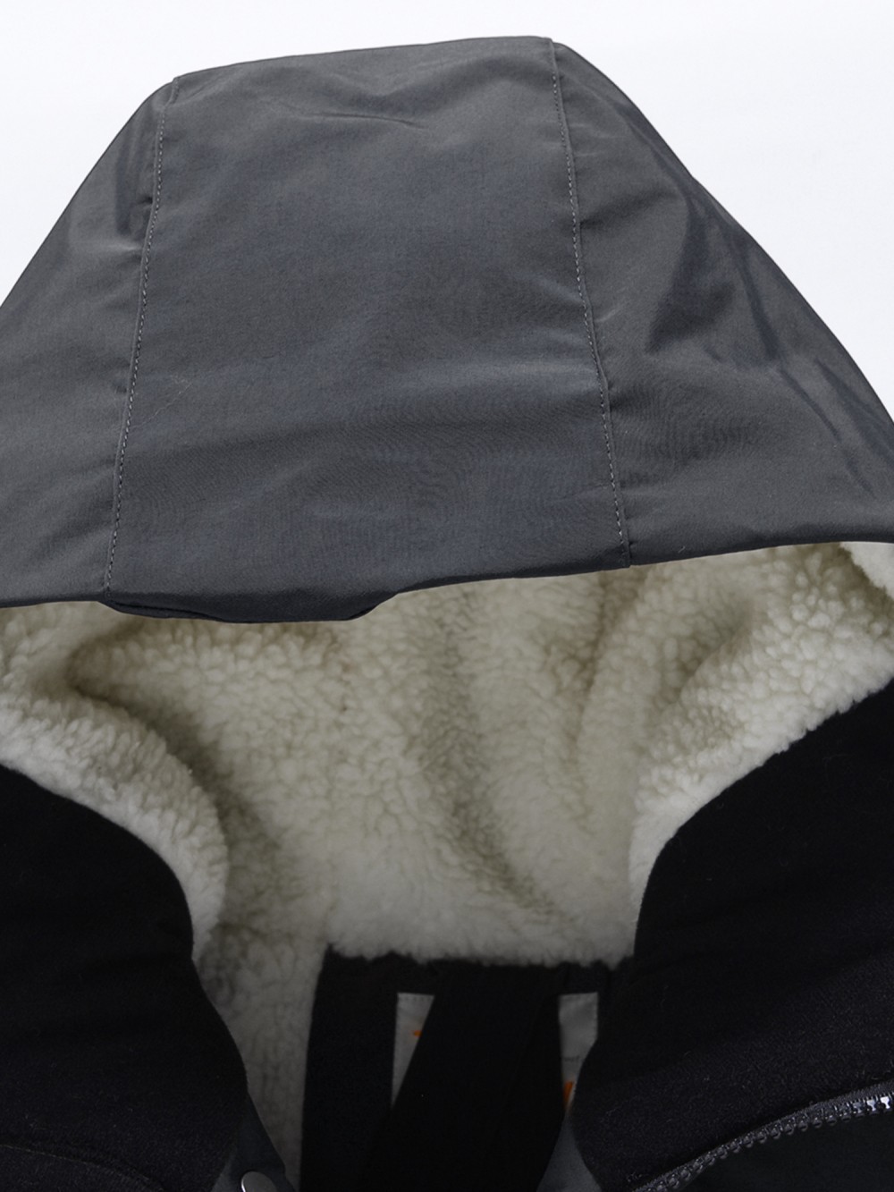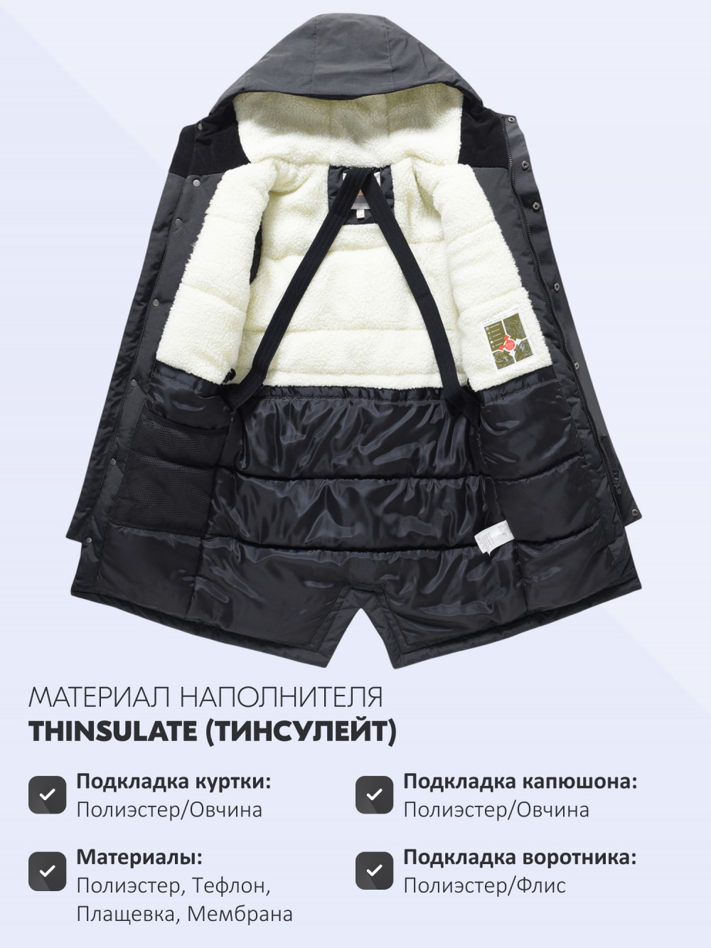 Внутренняя подкладка из овчины, полиэстера и флиса делает модель особенно уютной и приятной к телу. Капюшон несъёмный, он плотно прилегает и надёжно защищает голову в непогоду. Стояче-отложной воротник прикрывает шею и обеспечивает дополнительную защиту от ветра.