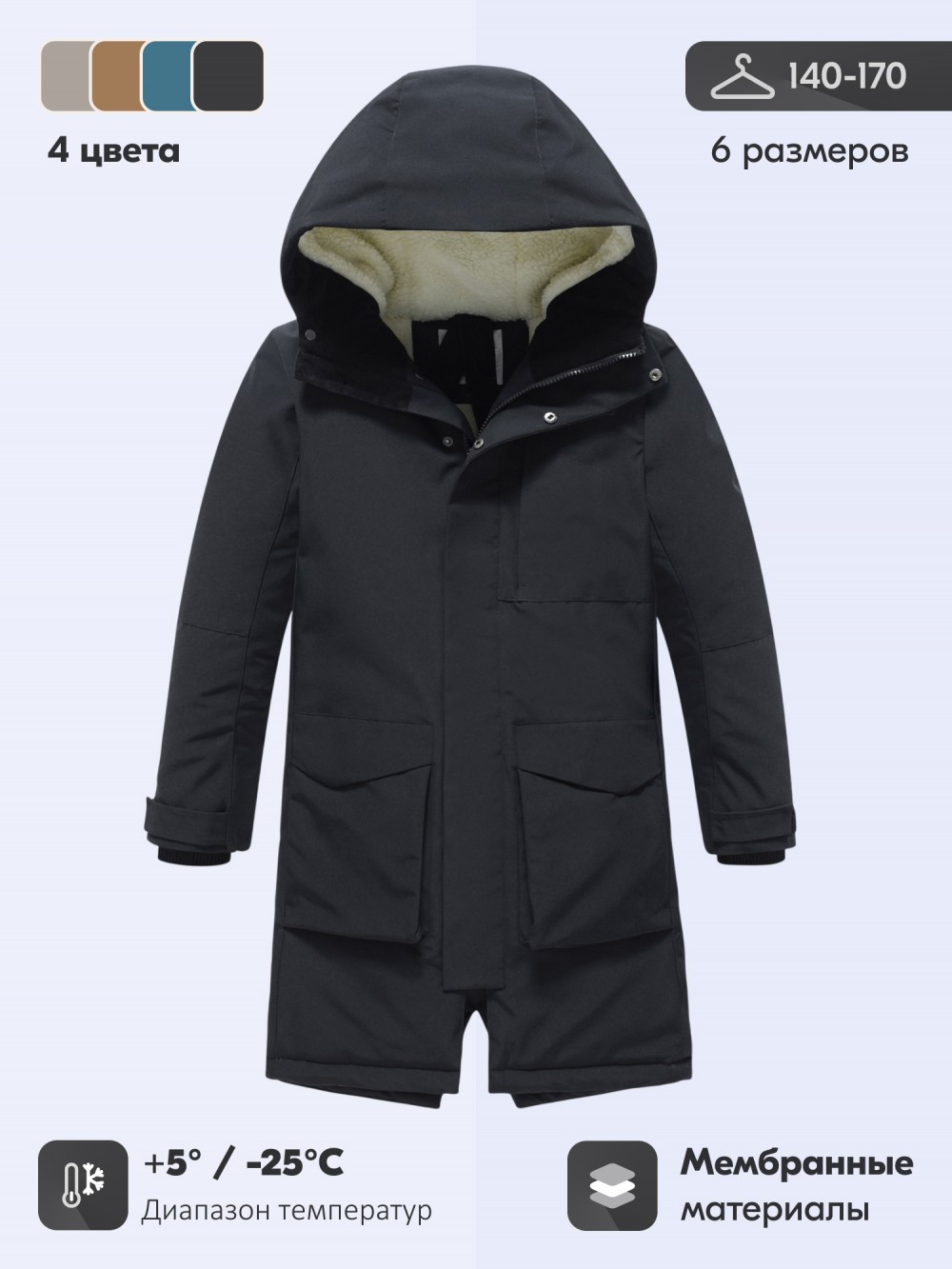 Эта парка представлена в стильных универсальных цветах — коричневом, тёмно-зелёном, чёрном и бежевом. Модель станет отличным выбором для родителей, которые ищут тёплую, удобную и долговечную зимнюю парку для мальчика-подростка, где сочетаются практичность, современный дизайн и комфорт.
