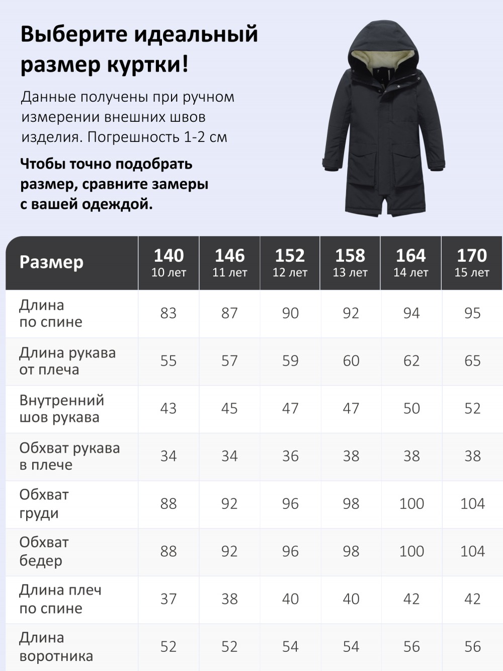 | Размер | 140 (10 лет), 146 (11 лет), 152 (12 лет), 158 (13 лет), 164 (14 лет), 170 (15 лет) |