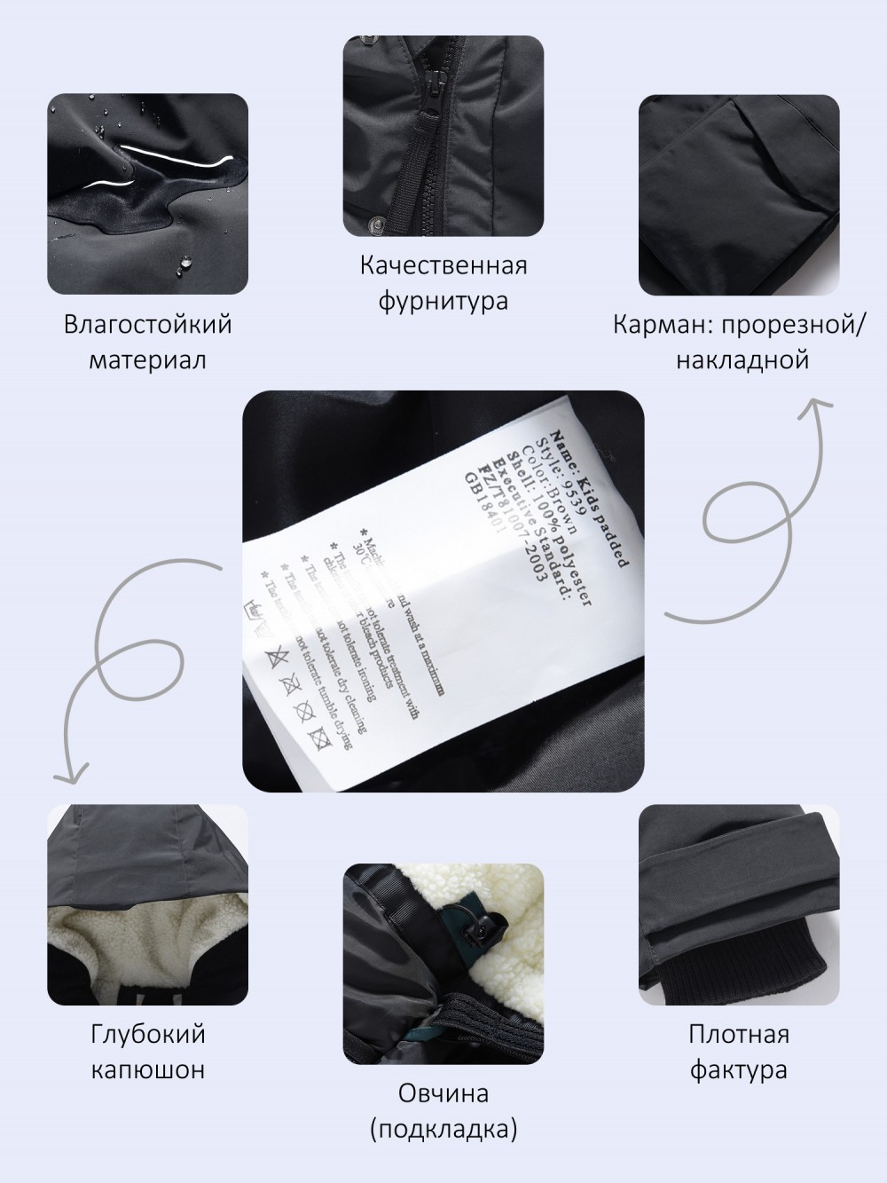 - Особенности модели: водоотталкивающий материал, гипоаллергенный материал, дышащий материал, с начесом, светоотражающие детали, с разрезом