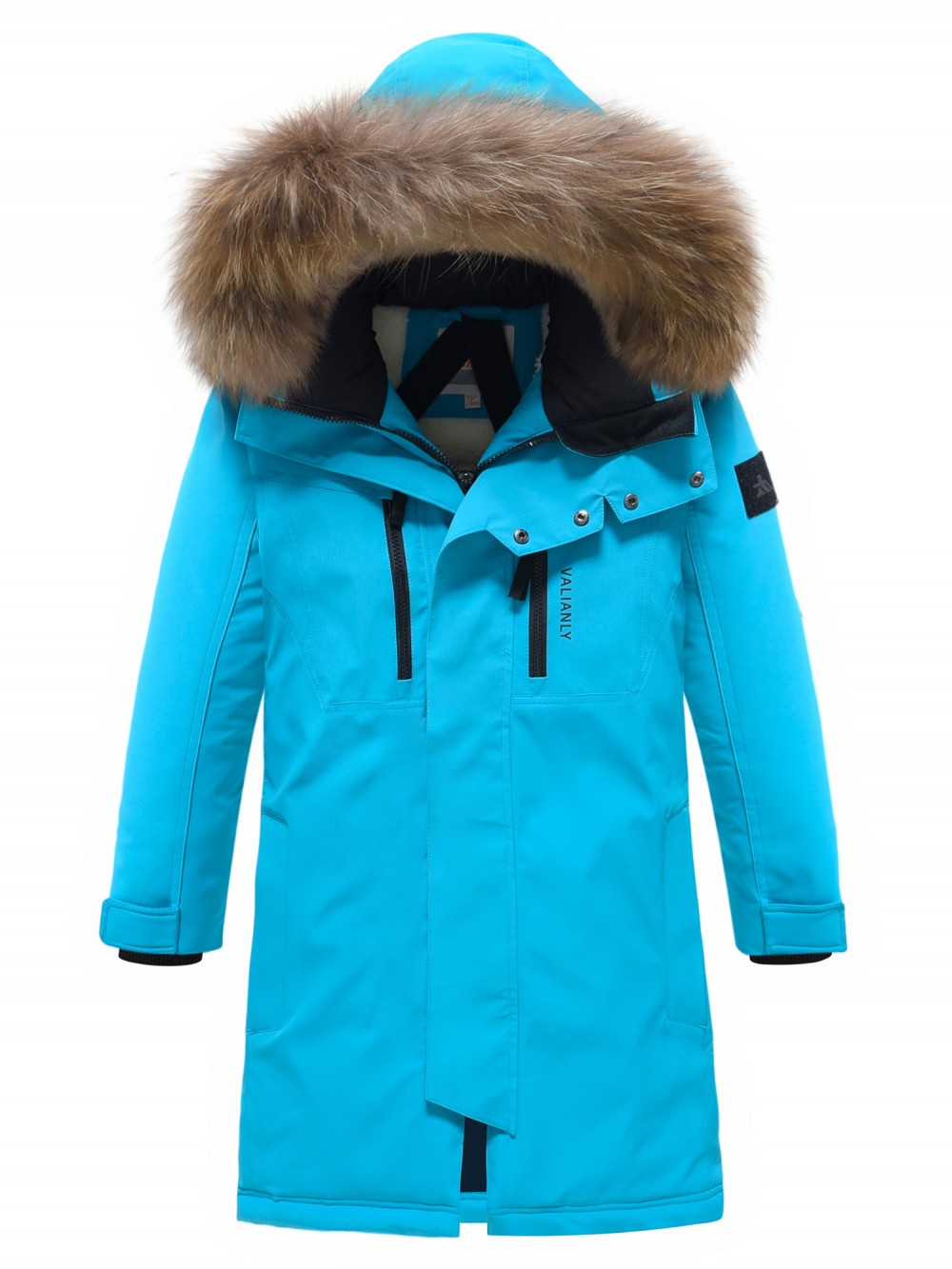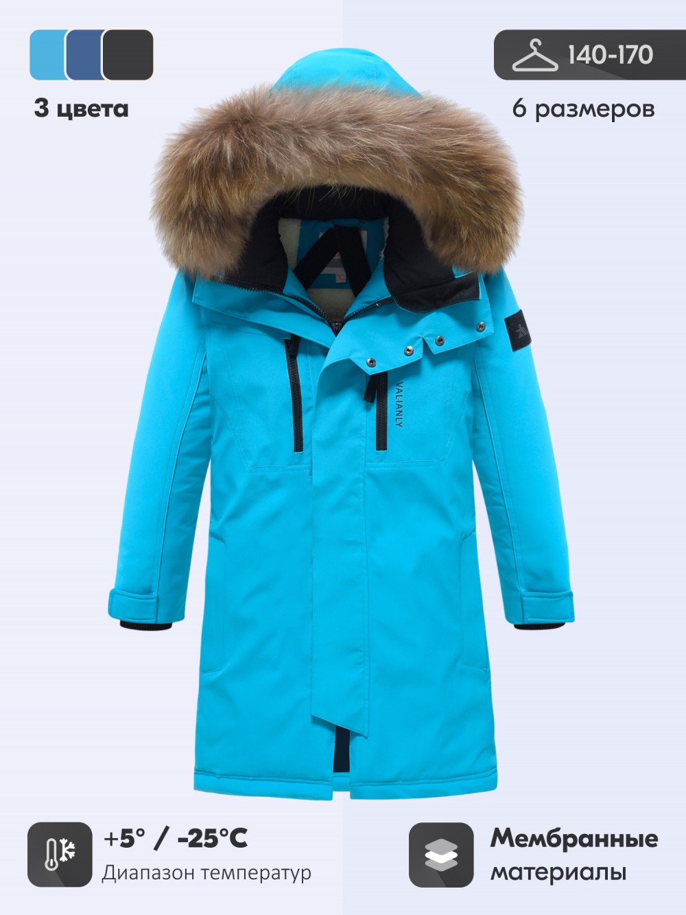 Парка зимняя подростковая для мальчика с капюшоном и мехом голубого цвета 9537Gl — VALIANLY