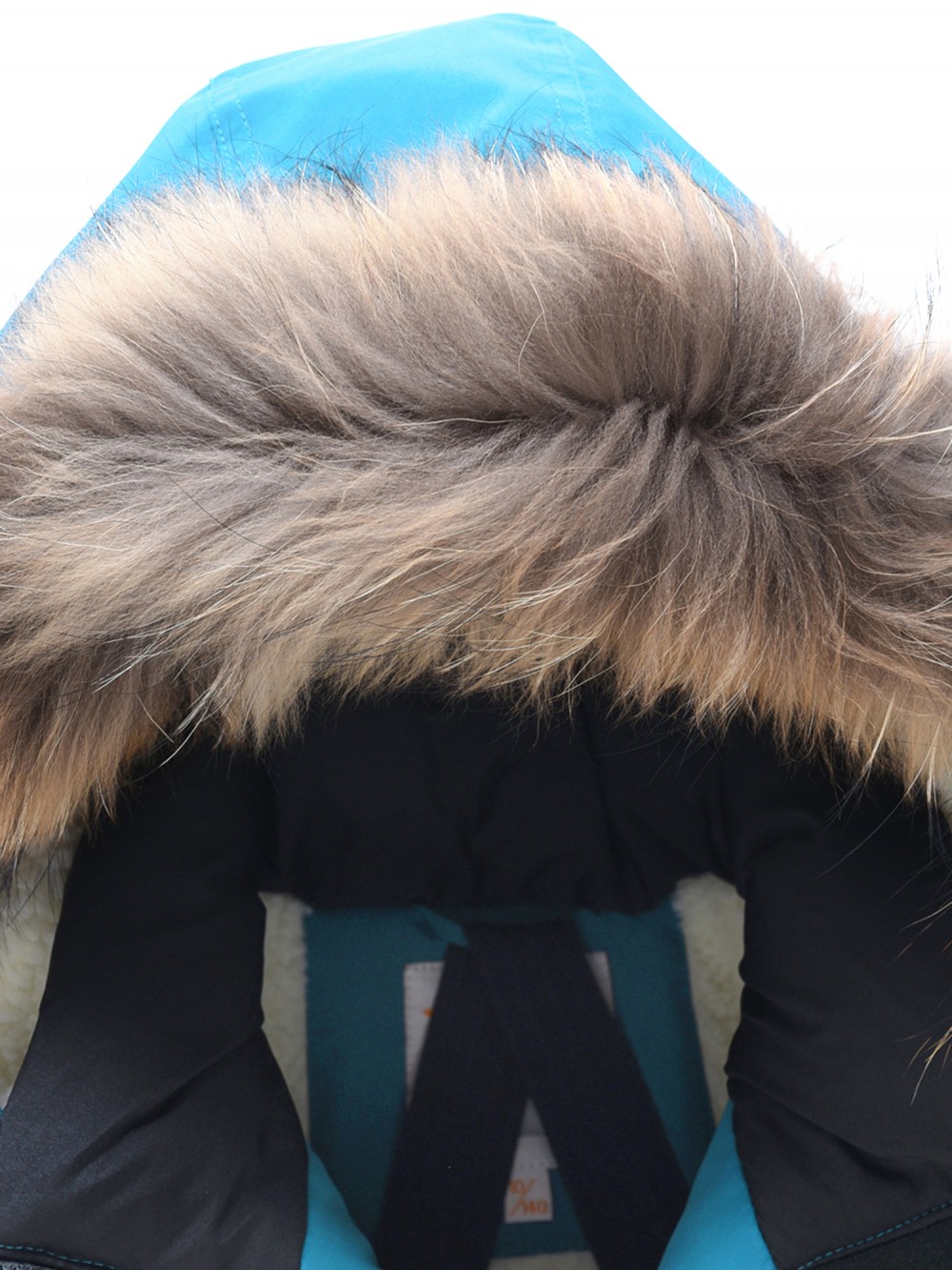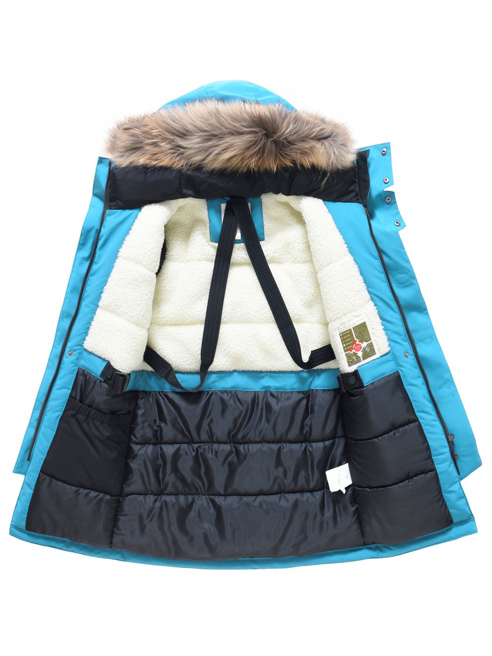 Внутренняя подкладка из овчины, полиэстера и флиса делает модель особенно уютной и приятной к телу. Капюшон несъёмный, он плотно прилегает к голове и дополнительно защищает от непогоды. Опушка из натурального меха енота на молнии при желании легко снимается. Стояче-отложной воротник надёжно закрывает шею и обеспечивает защиту даже без шарфа.
