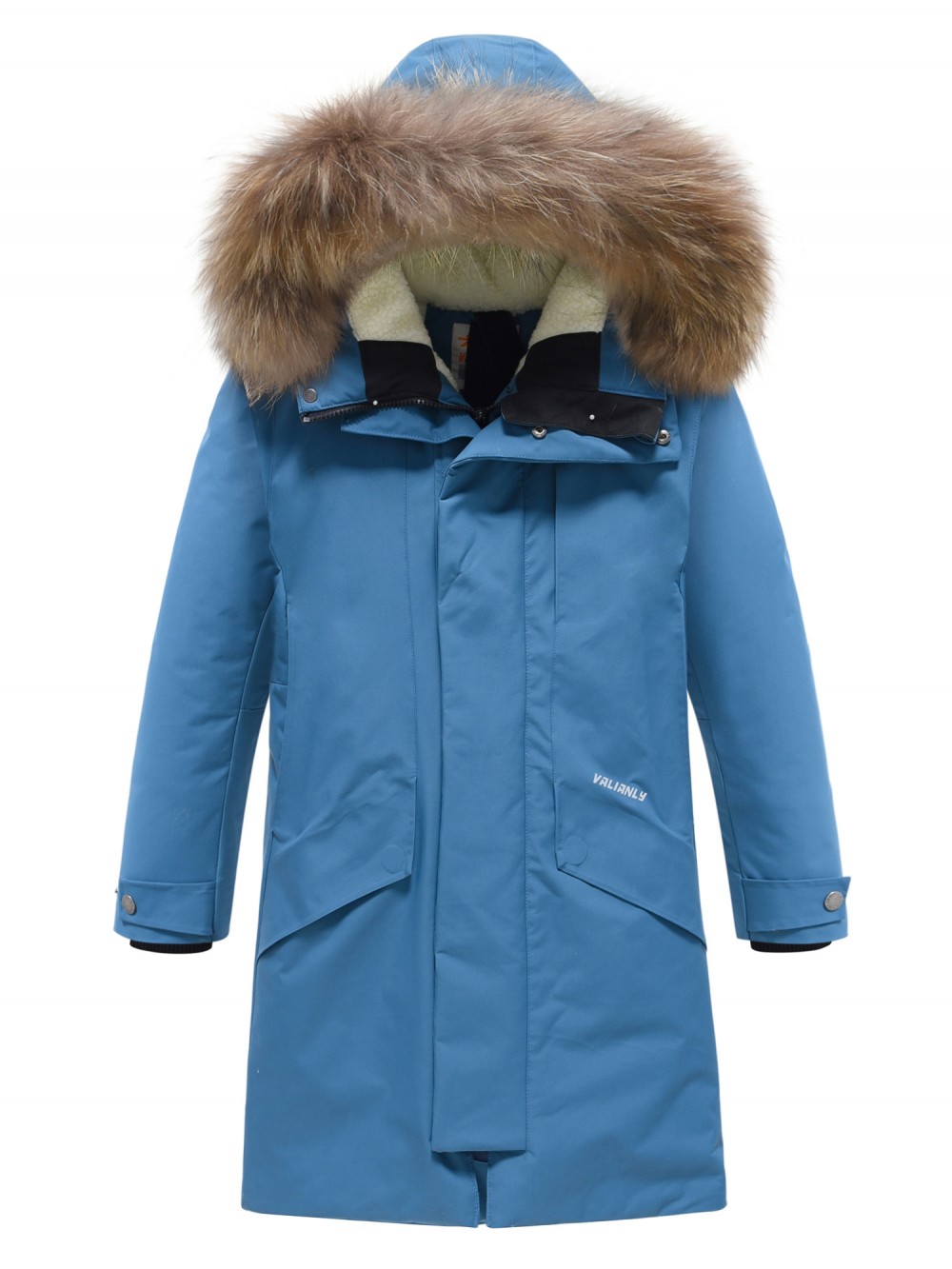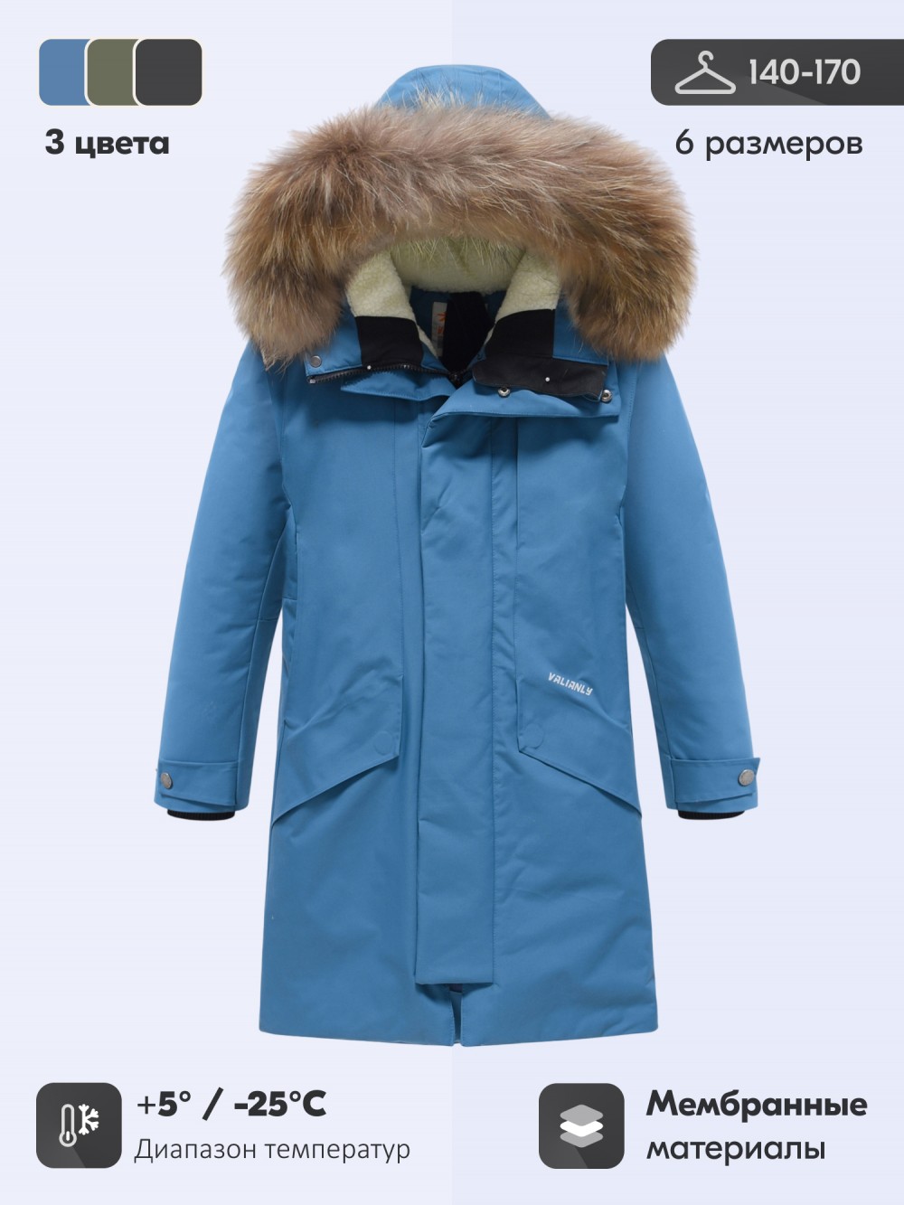 Парка зимняя подростковая для мальчика с капюшоном и мехом синего цвета 9535S — VALIANLY