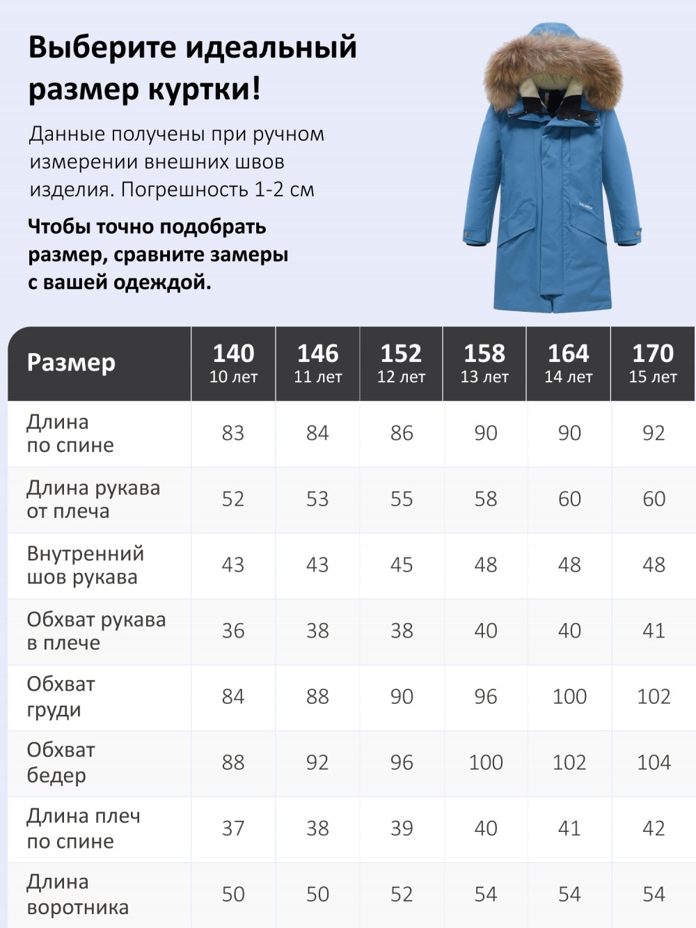 | Размер | 140 (10 лет), 146 (11 лет), 152 (12 лет), 158 (13 лет), 164 (14 лет), 170 (15 лет) |