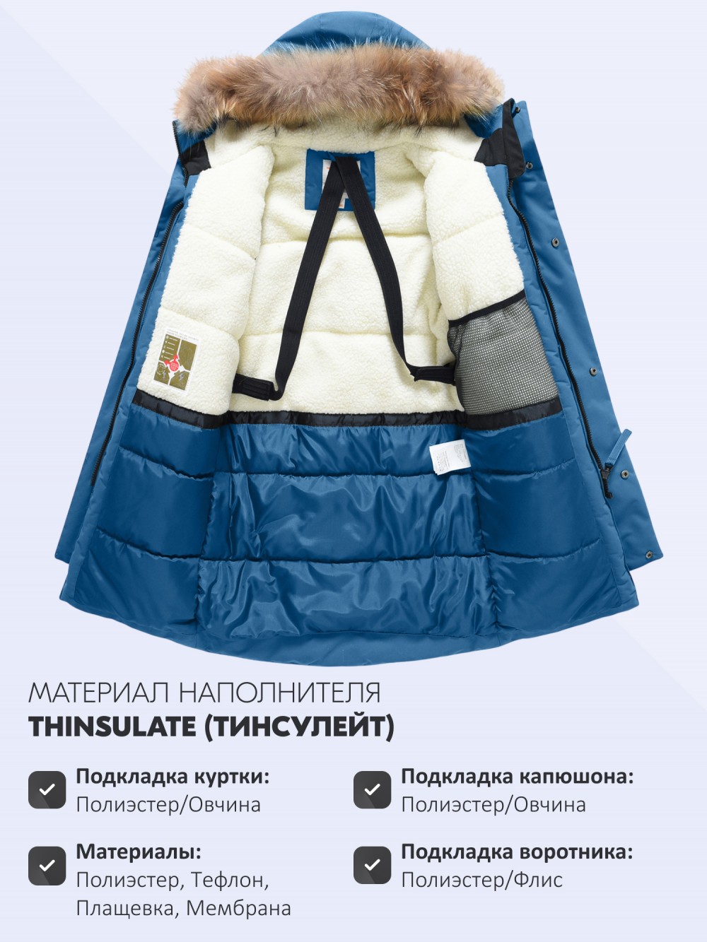 - Материал подкладки куртки: Полиэстер/Овчина