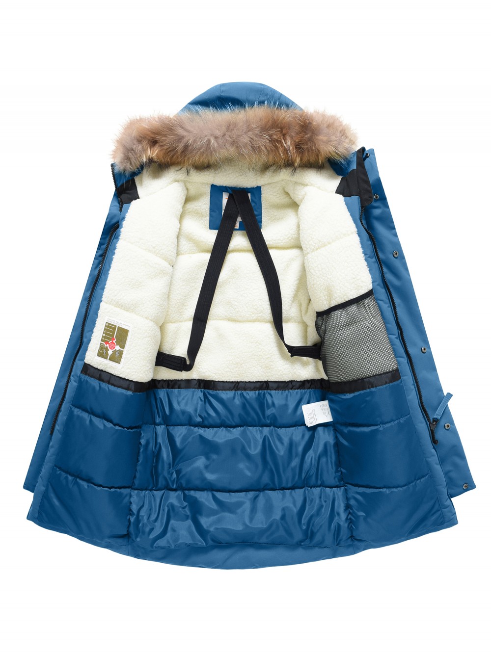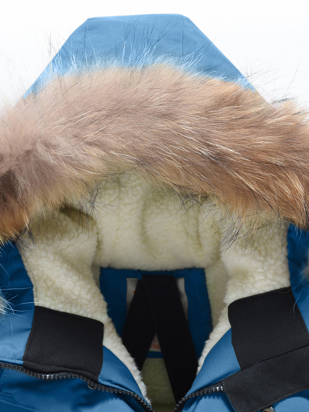 Внутренняя подкладка из овчины, полиэстера и флиса делает парку особенно уютной и приятной к телу. Тёплый капюшон с натуральным мехом енота надёжно защищает от снега и ветра, а опушка на молнии при желании легко снимается. Стояче-отложной воротник прикрывает шею и даёт дополнительную защиту в непогоду.