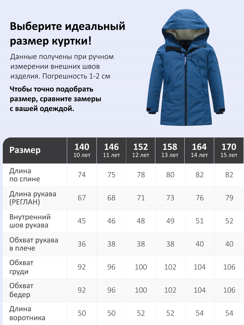 | Размер | 140 (10 лет), 146 (11 лет), 152 (12 лет), 158 (13 лет), 164 (14 лет), 170 (15 лет) |